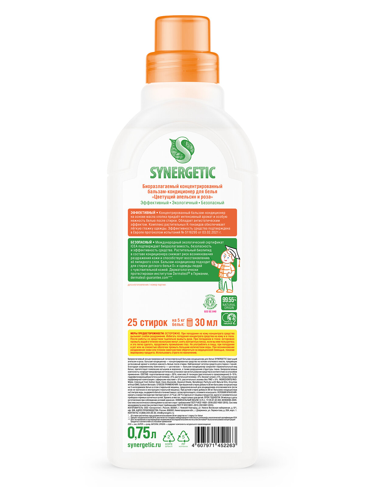 Кондиционер - ополаскиватель для стирки белья SYNERGETIC "Цветущий апельсин и роза" гипоаллергенный, концентрированный, 0,75л, 25 стирок интересное: