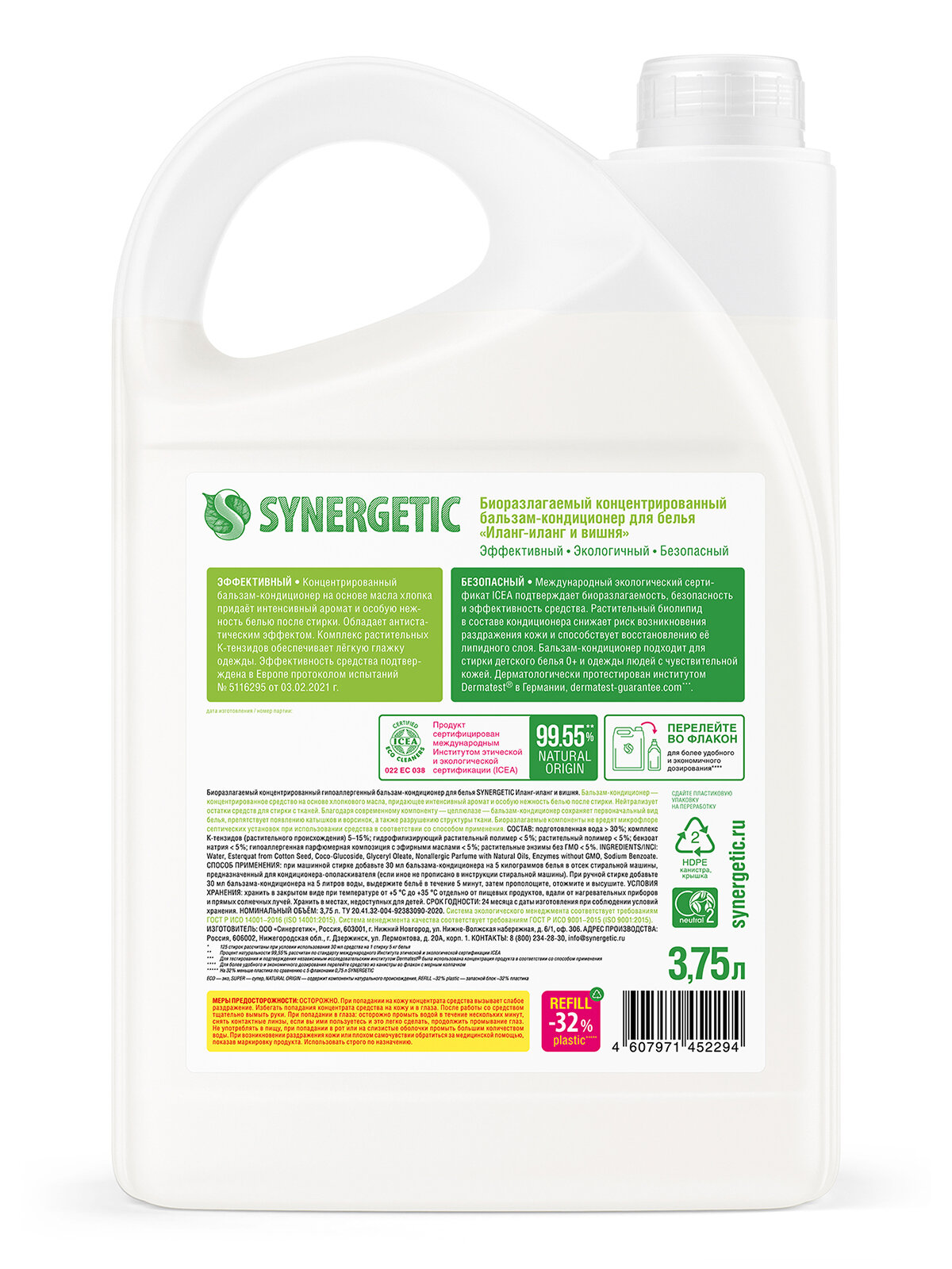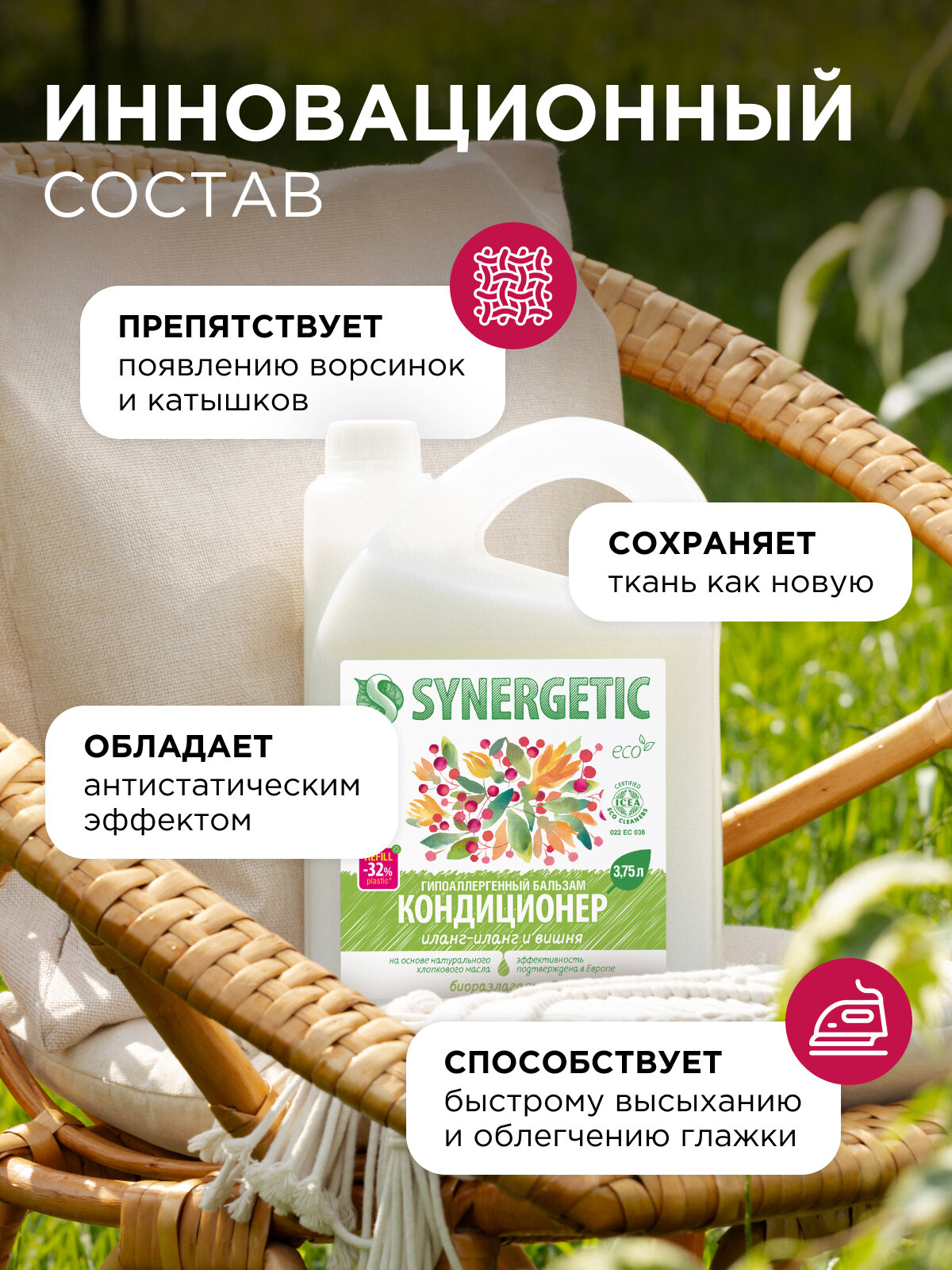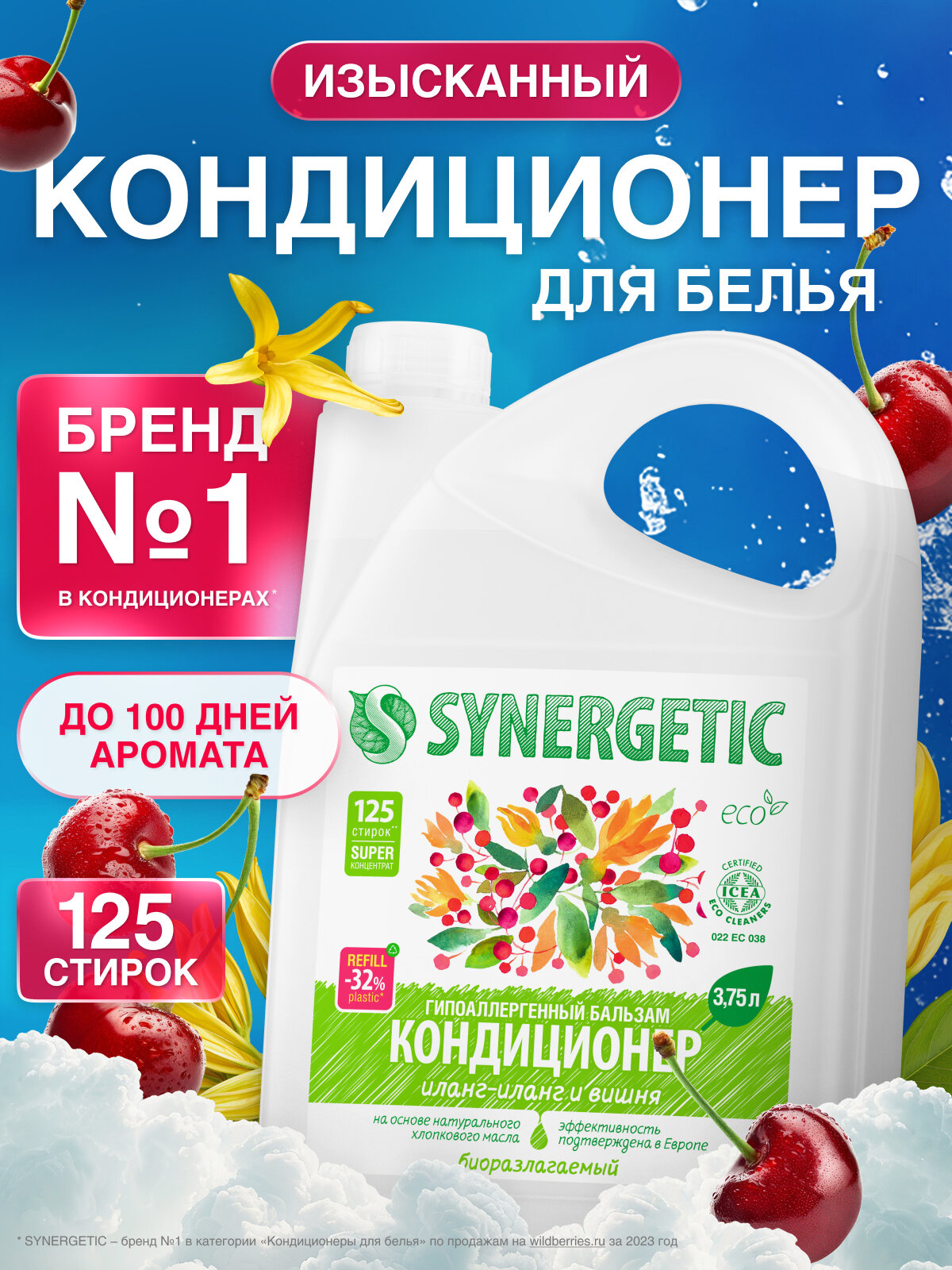 Бальзам-кондиционер для белья SYNERGETIC "Иланг-иланг и вишня", 3,75 л (125 стирок) интересное: