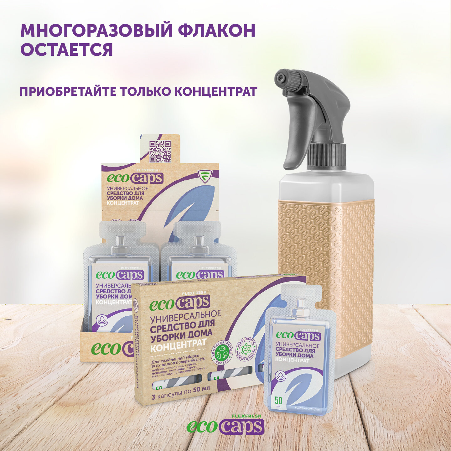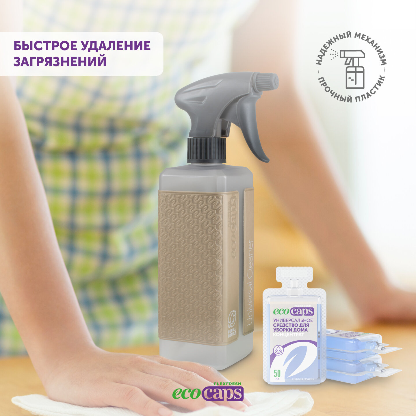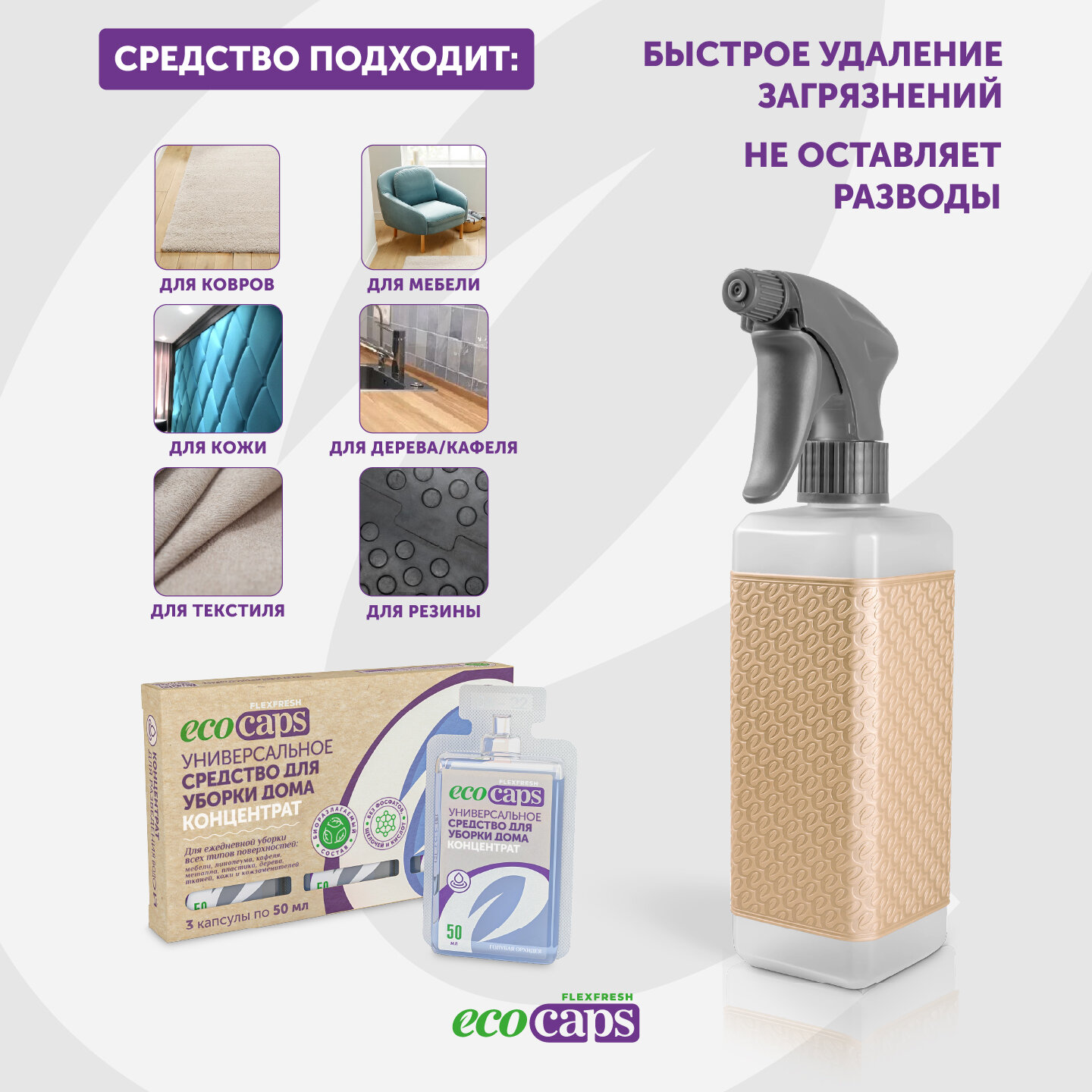 Купить Универсальное средство для уборки дома EcoCaps (концентрат в капсулах) 3 шт + бежевый флакон 500 мл