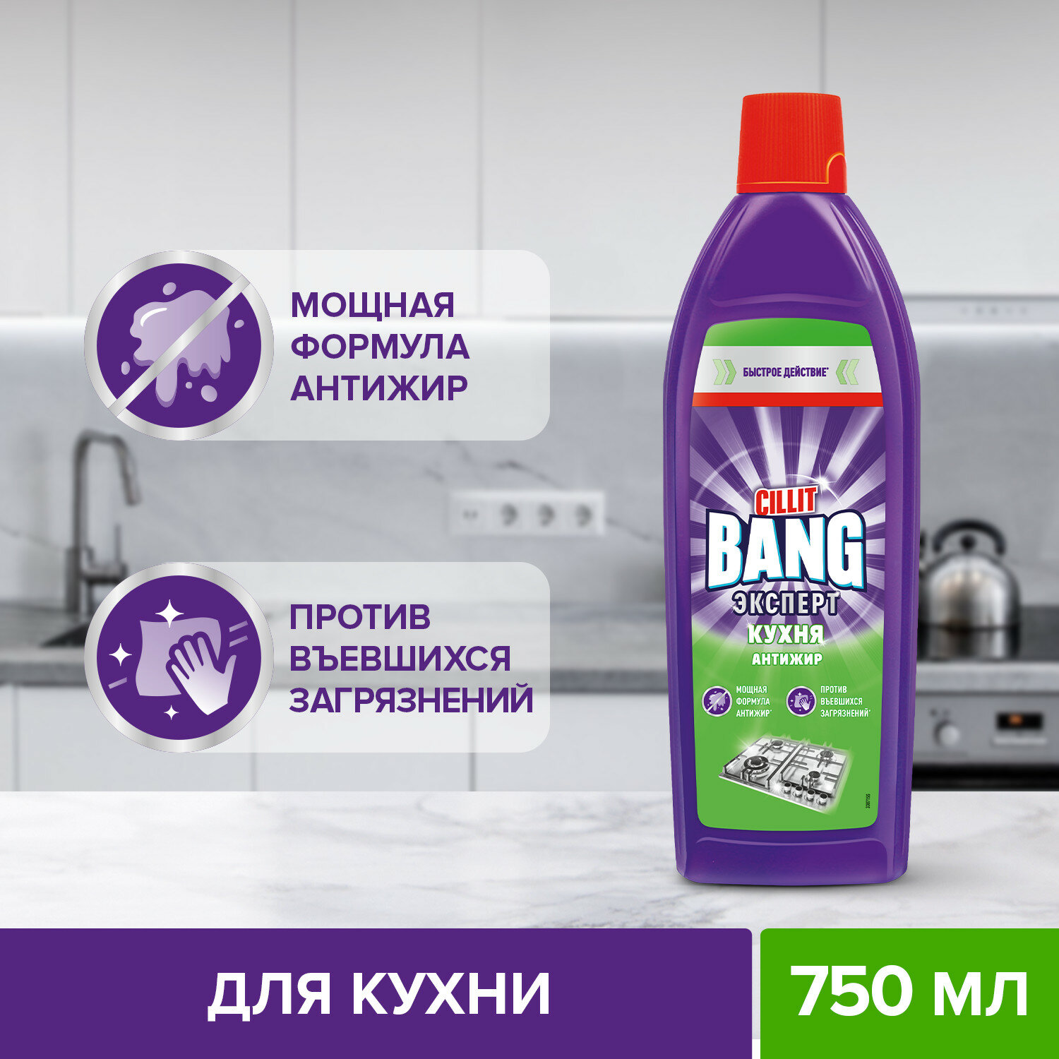Купить Чистящее средство Антижир+Сияние CILLIT BANG для кухни, для плиты духовки и гриля, гель жироудалитель,750мл