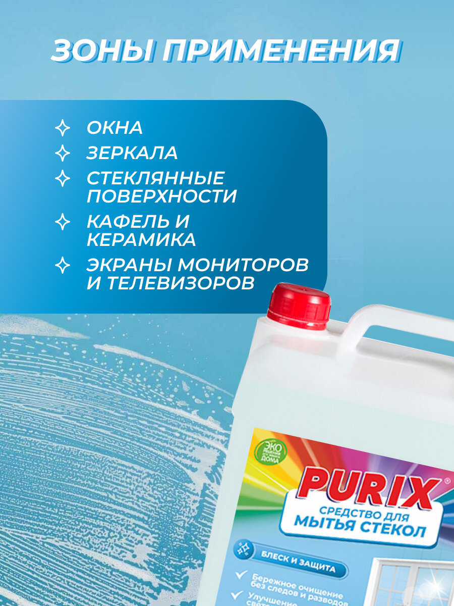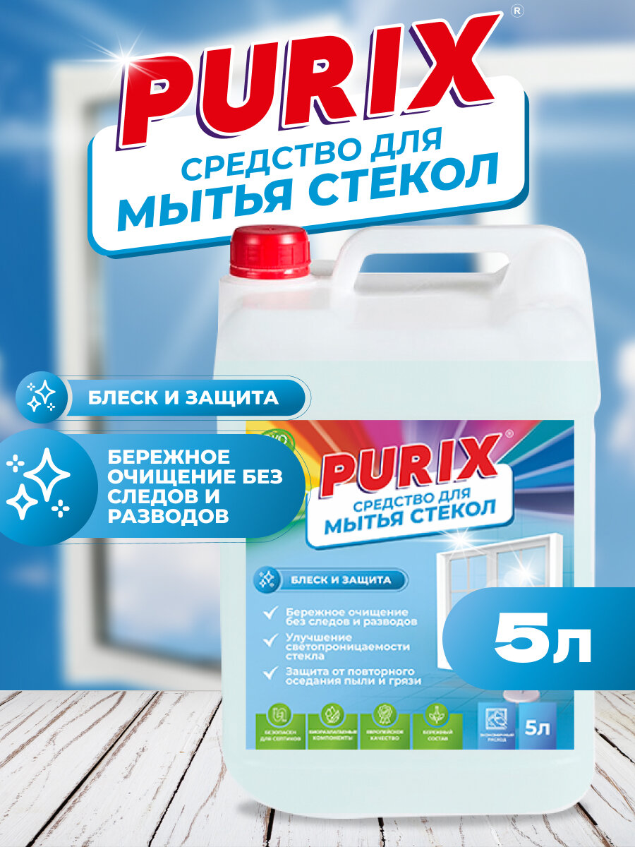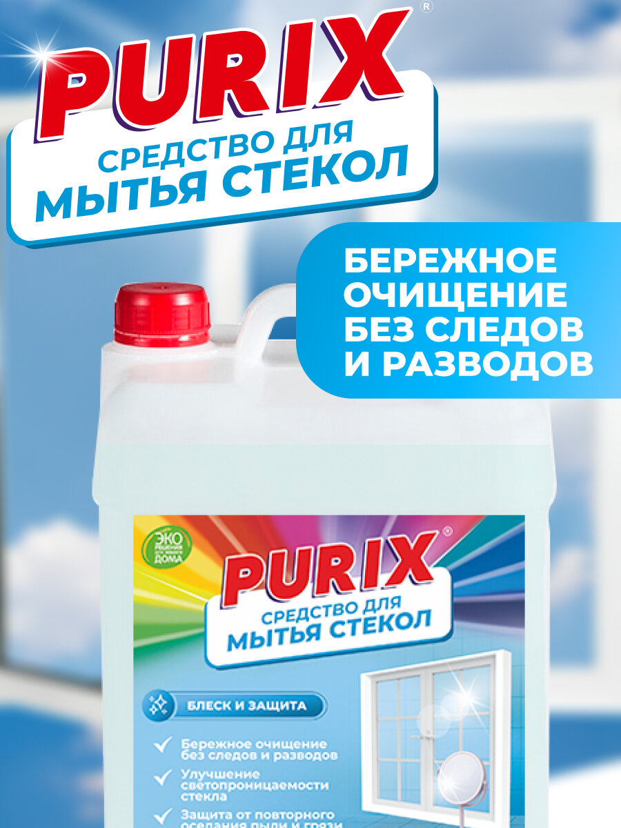 Средство для мытья окон, стекол и зеркал Purix, блеск без разводов, канистра 5 л интересное: