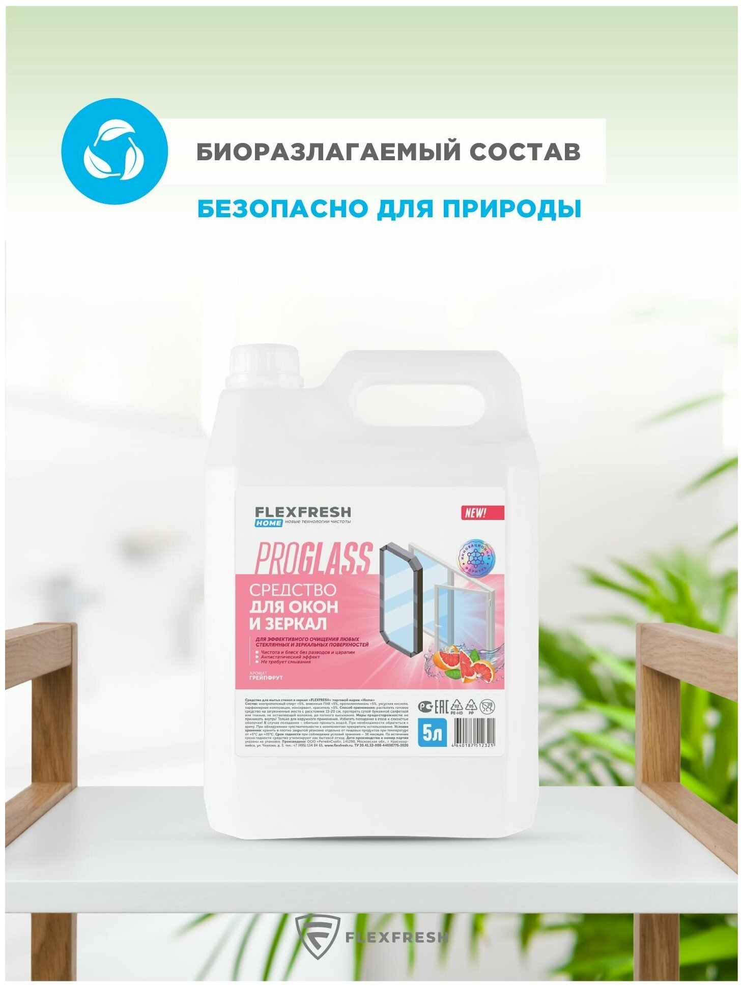 Купить Средство для мытья окон, стекол и зеркал Flexfresh, аромат грейпфрута, канистра 5 л