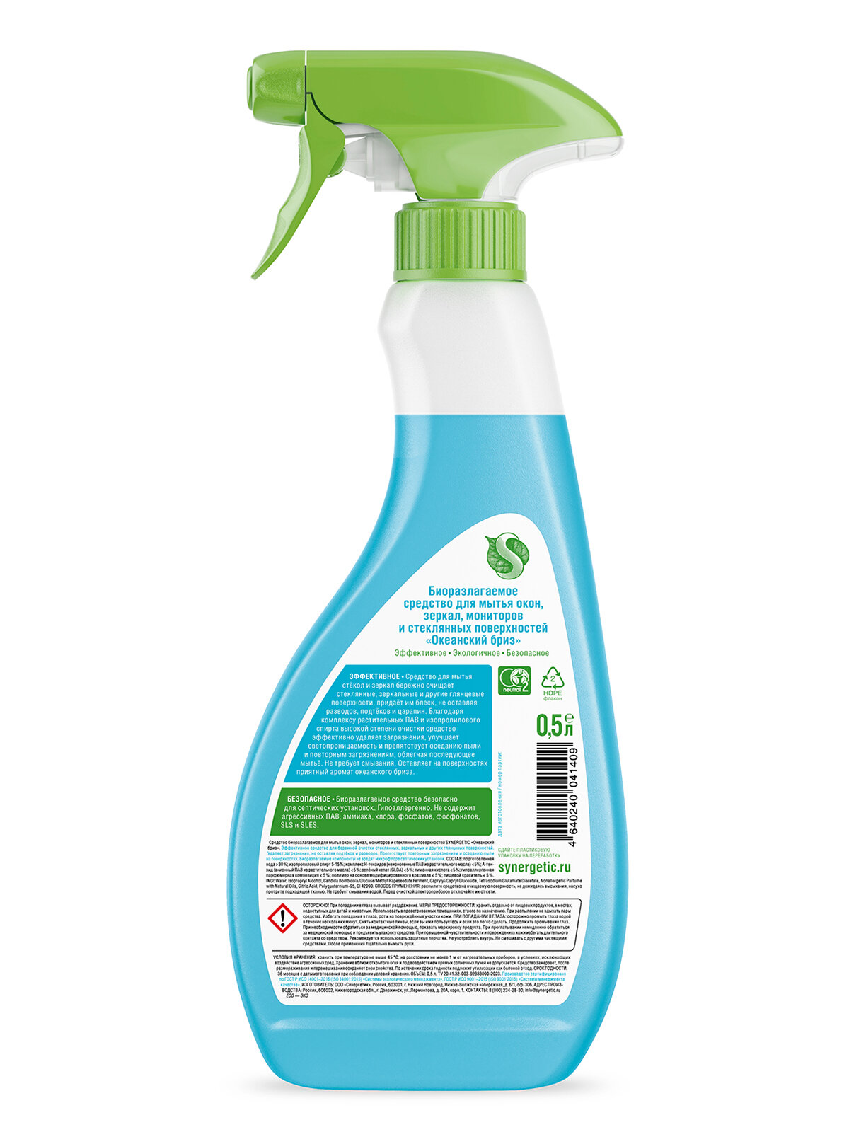 Купить Средство биоразлагаемое для мытья окон, зеркал, мониторов и стеклянных поверхностей SYNERGETIC "Океанский бриз", 0,5 л
