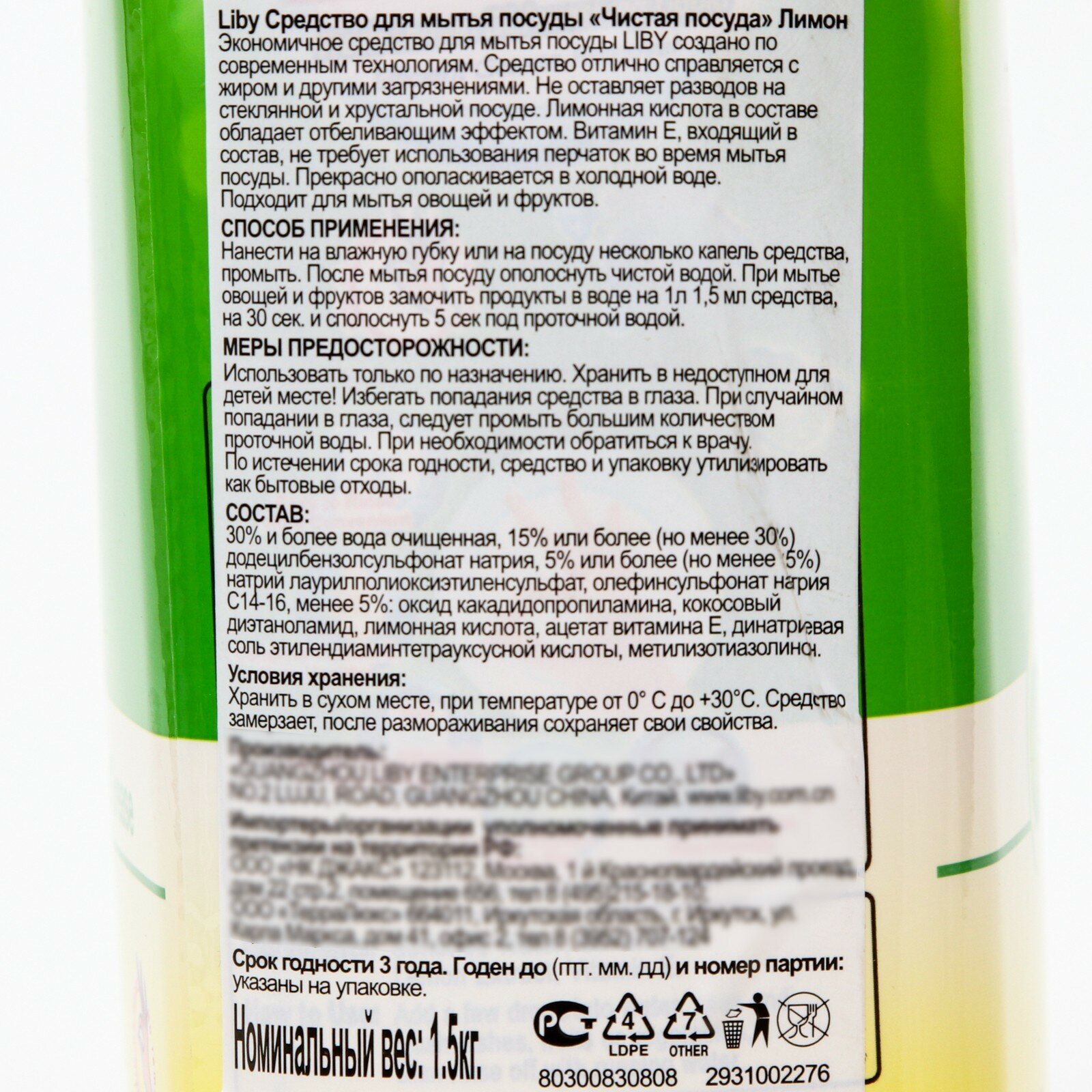 Купить Liby Средство для мытья посуды, овощей и фруктов Лимон 1,5 кг