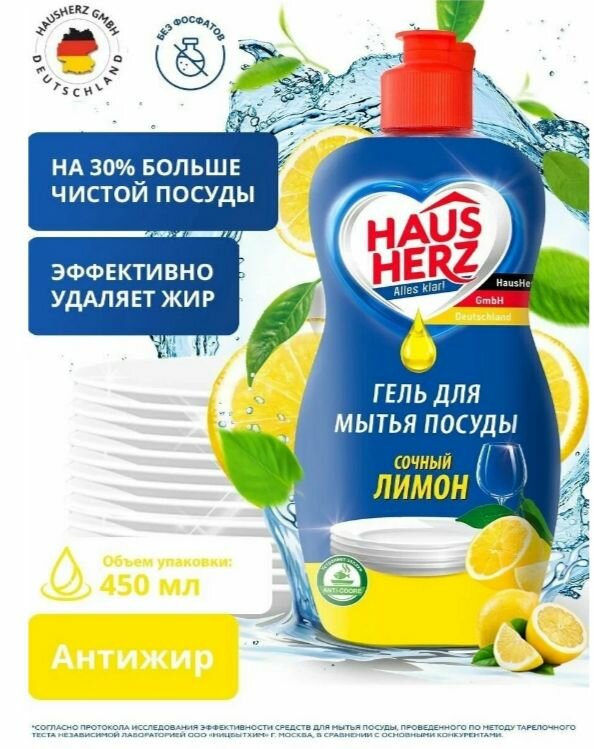 HausHerz Сочный лимон средство для мытья посуды бесфосфатное 450 мл