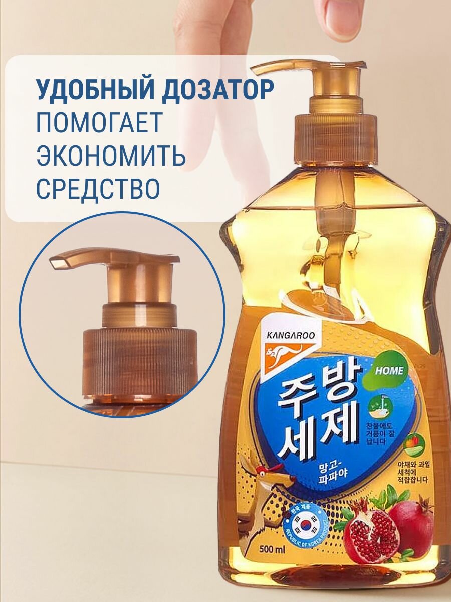Корейское средство для посуды Kangaroo Home с ароматом манго-папайя 500 мл, жидкость для мытья детской посуды, фруктов и овощей