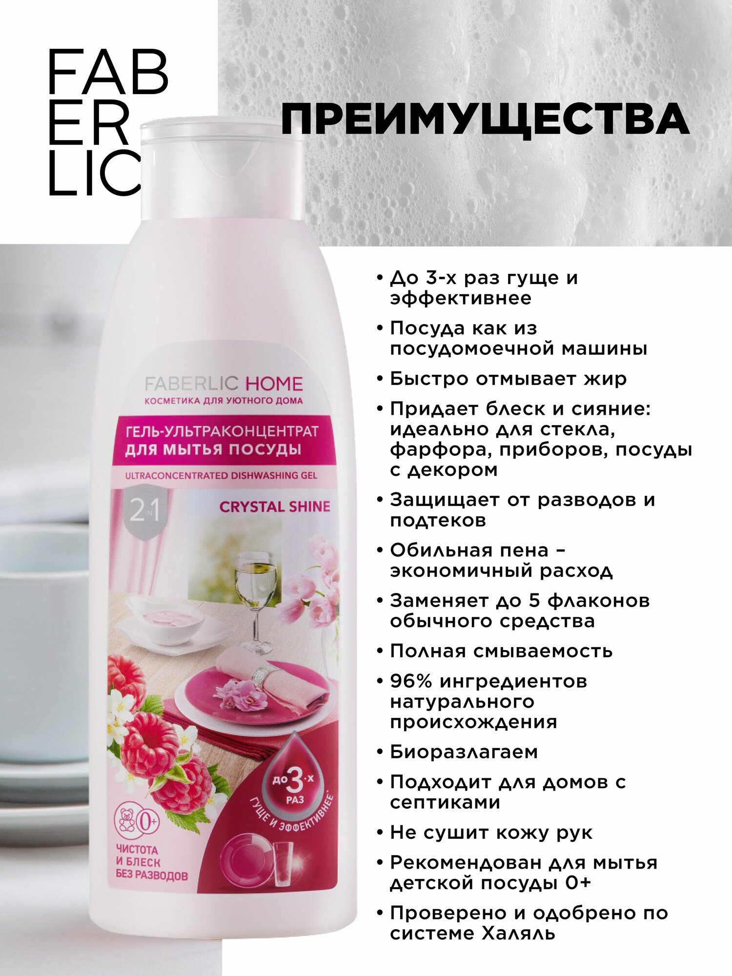 Купить Faberlic Гель для мытья посуды, ультраконцентрат 2 в 1 "Кристальный блеск" Faberlic Home, средство для мытья посуды Фаберлик, 500 мл