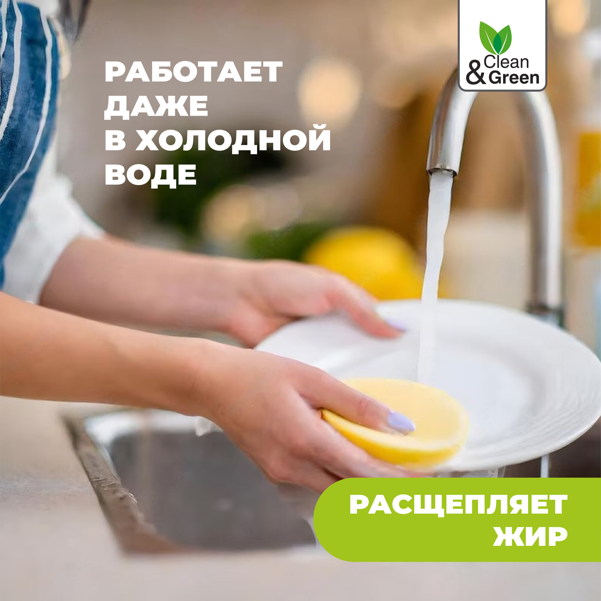 Средство для мытья посуды CLEAN&GREEN Greeny Light, для холодной воды, лимон, 1л