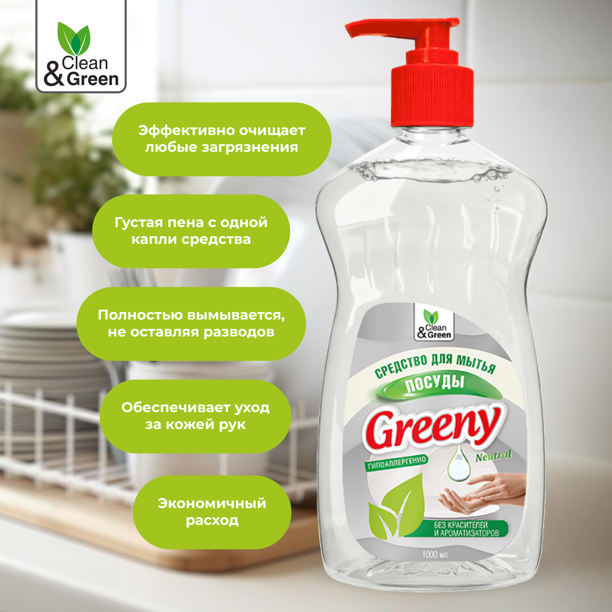 Купить Средство для мытья посуды Greeny Neutral с дозатором 1000 мл Clean&Green CG8141