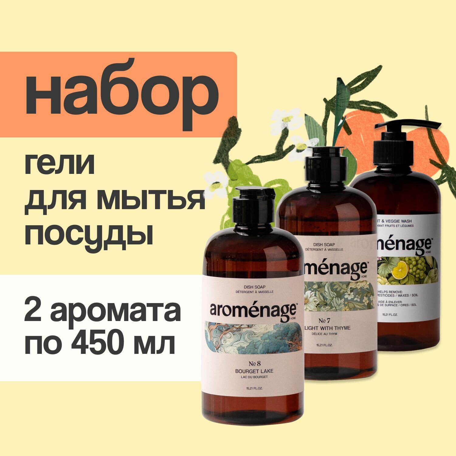 AROMENAGE Набор Гель для мытья посуды Наслаждение Тимьяном/Горное Озеро Бурже/Гель для мытья овощей и фруктов 0,45 л х 3 шт интересное: