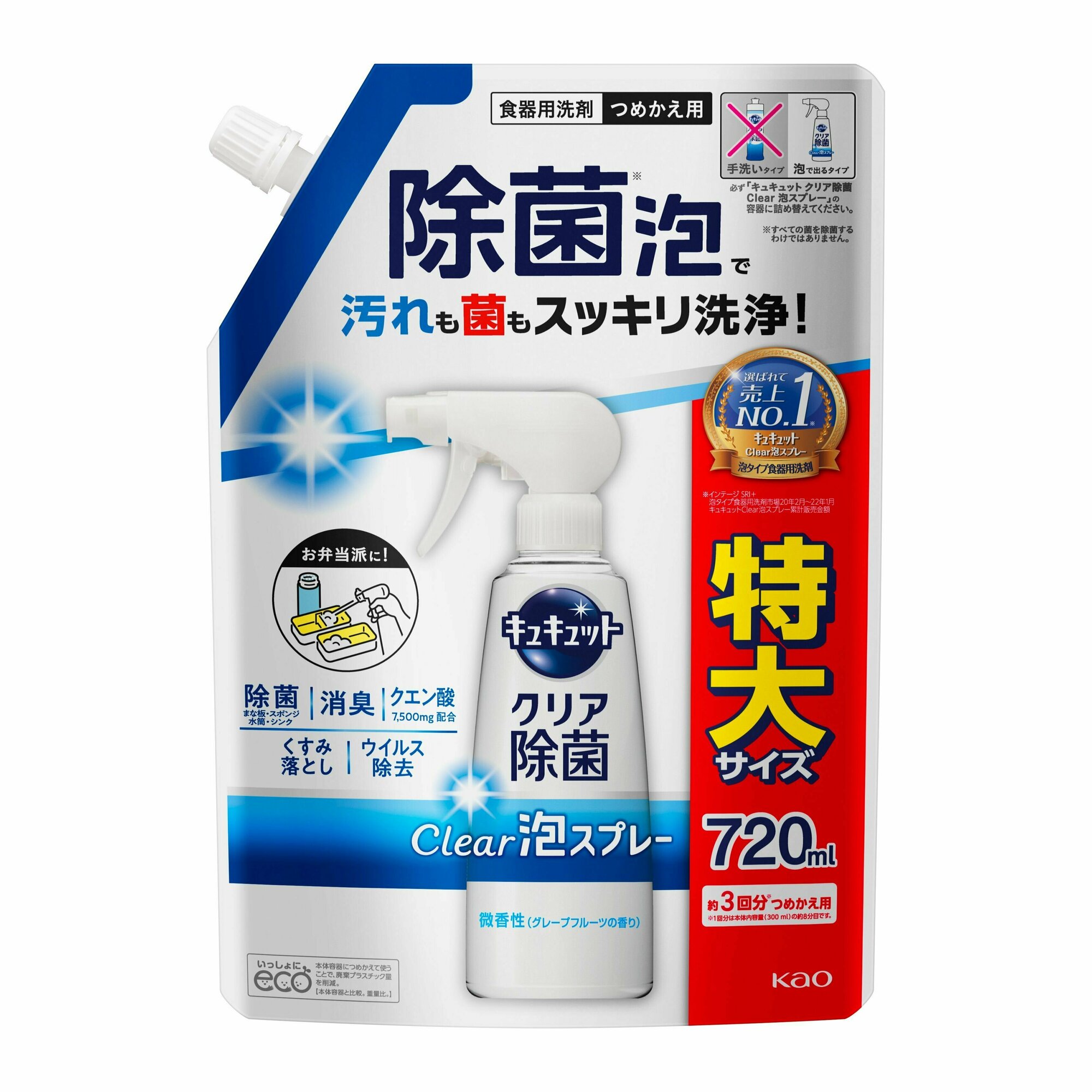 Купить KAO Средство для мытья посуды "CuCute Clear" (с лимонной кислотой и ароматом грейпфрута / пена-спрей для мытья без губки) 720 мл, сменная упаковка с крышкой
