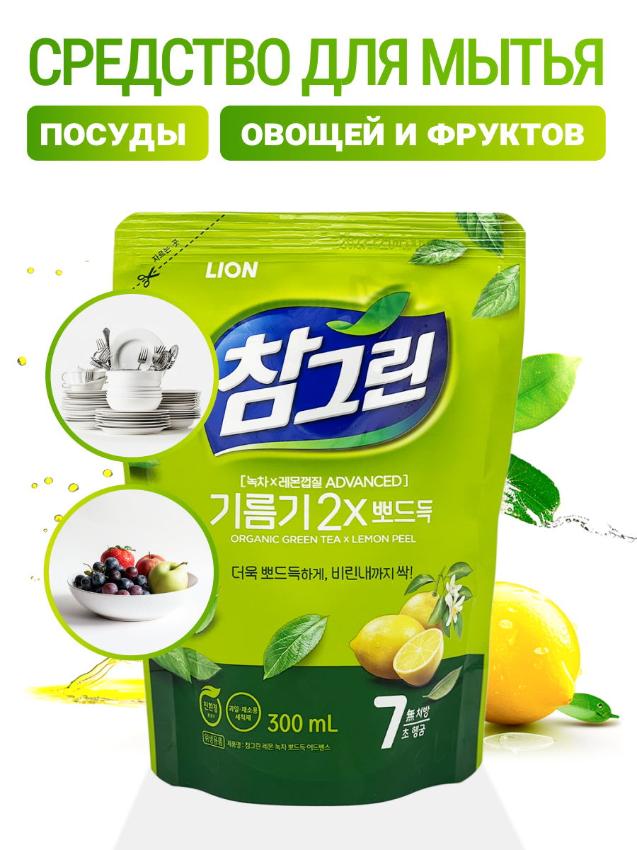 Купить Lion Средство для мытья посуды, овощей и фруктов с экстрактом зеленого чая Chamgreen Green Tea Refill, 300 мл
