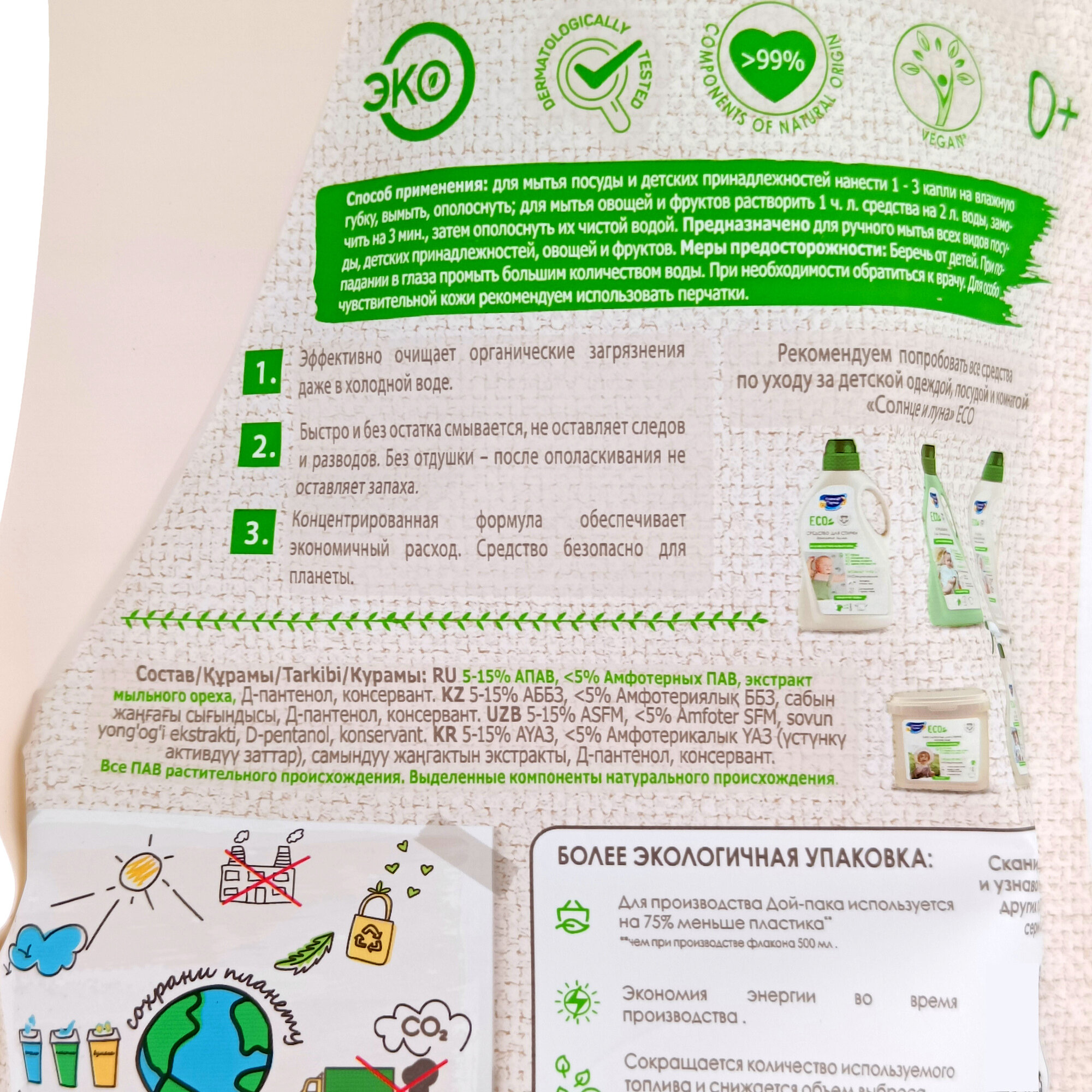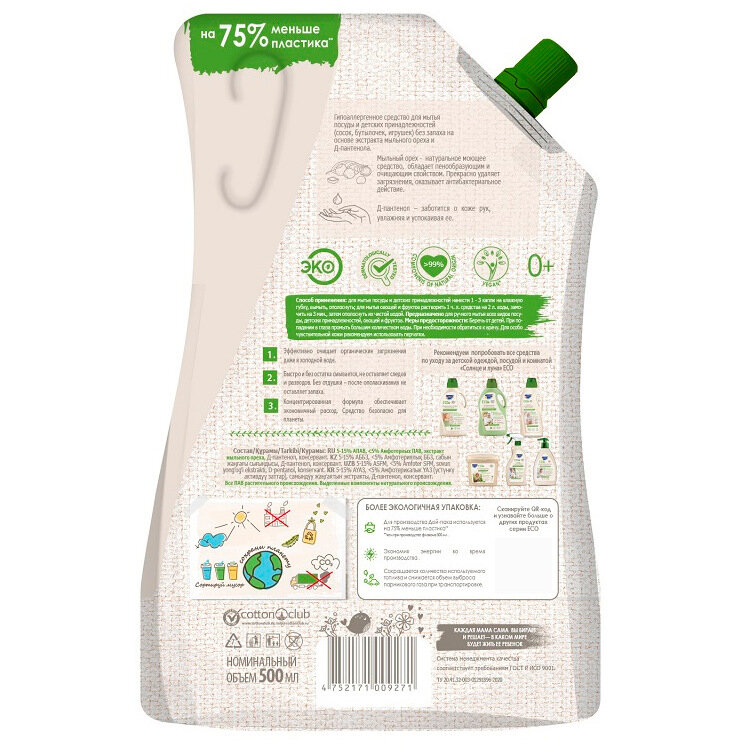 Средство для мытья посуды и детских принадлежностей Солнце и Луна ECO, без запаха, дой-пак, 500 мл интересное: