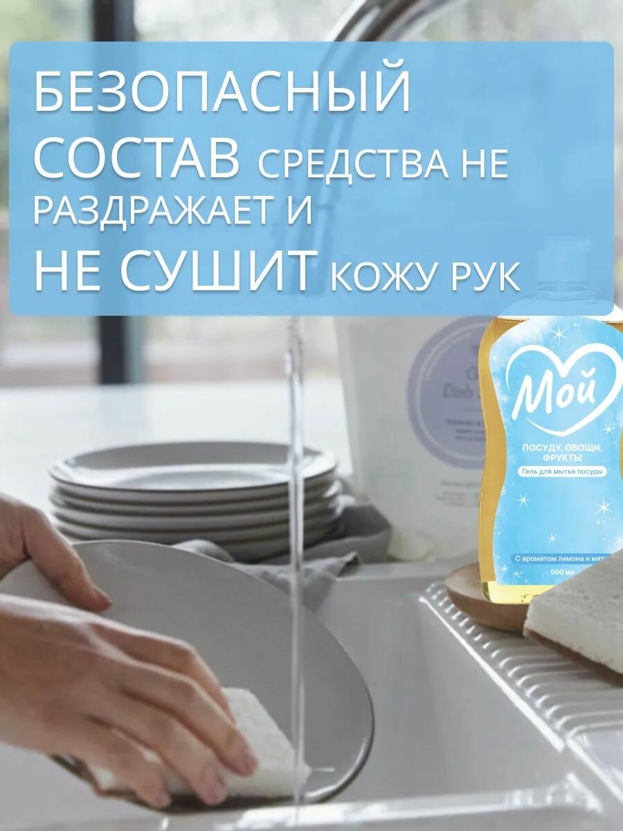 Средство для мытья посуды МОЙ с ароматом лимона и мяты 500 мл, моющий гель для детской посуды, фруктов, овощей интересное: