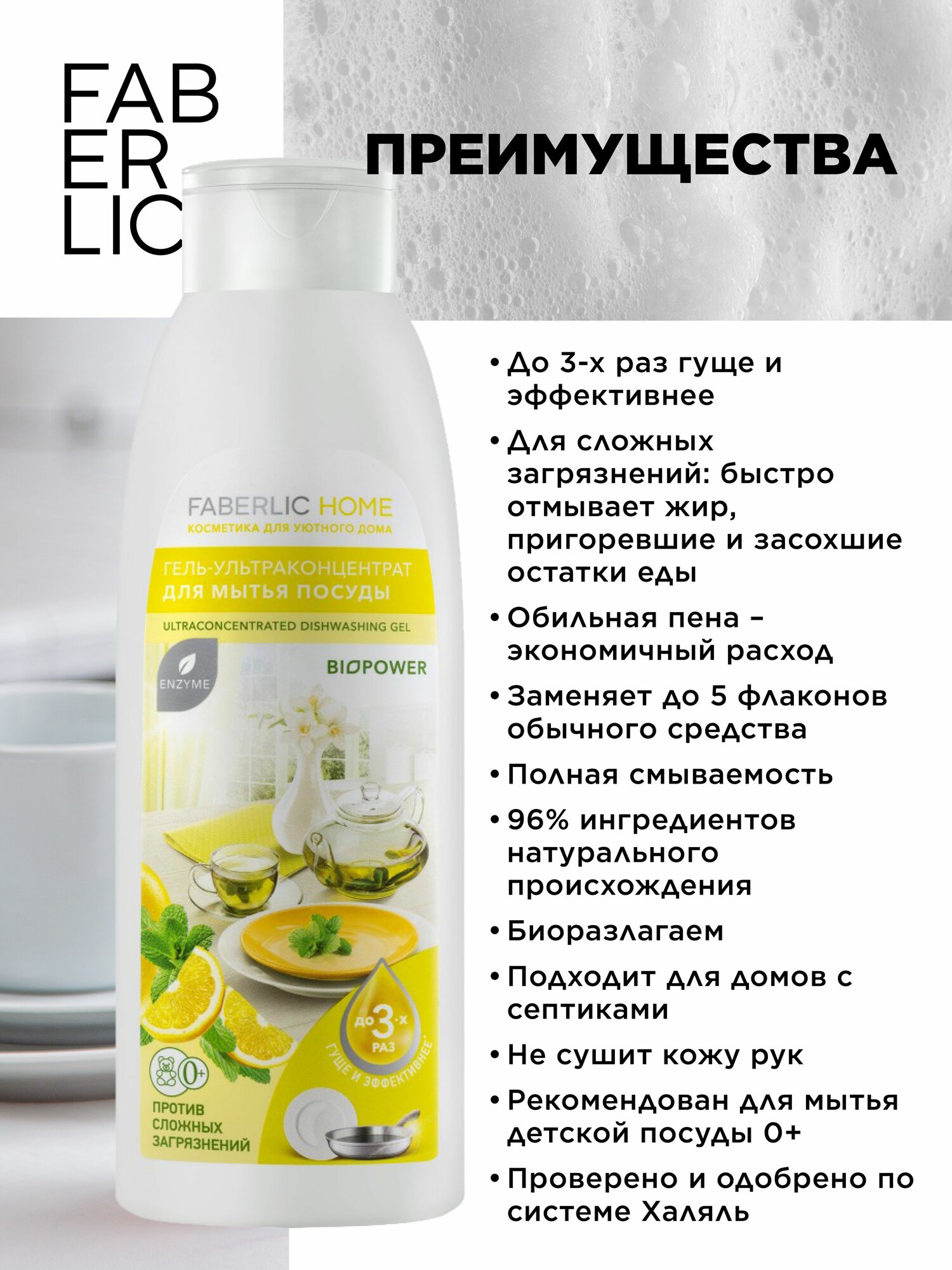 Купить Faberlic Гель для мытья посуды, ультраконцентрат, с биоэнзимами "Лимон и мята" Faberlic Home, средство для мытья посуды Фаберлик, 500 мл