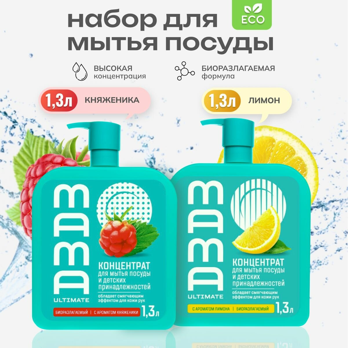 Набор средств для мытья посуды Mama Ultimate концентрат лимон 1,3 л + княженика 1,3 л интересное: