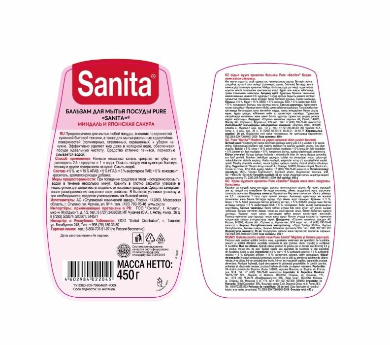 Sanita Бальзам для мытья посуды Pure (Миндаль/Японская сакура) Крышка 450г интересное: