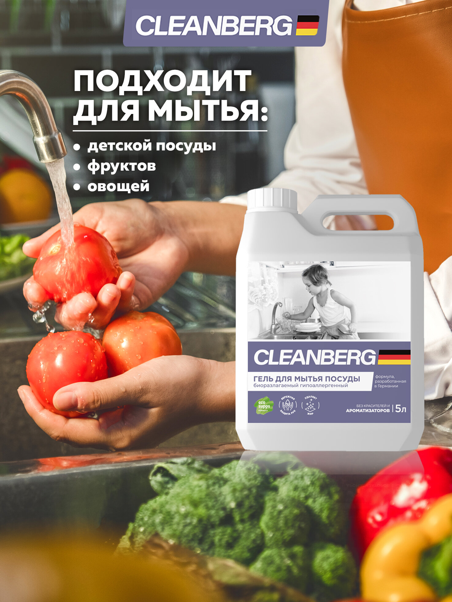 Средство для мытья посуды CLEANBERG без запаха гель концентрат для мытья посуды, 5л интересное: