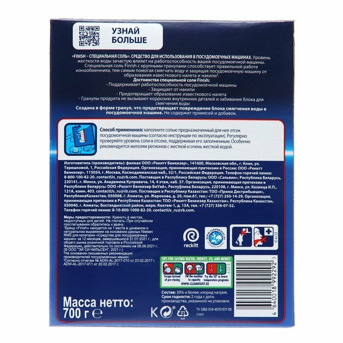 FINISH Соль Специальная для защиты посудомоечной машины от образования известкового налета и накипи, 700 гр. интересное: