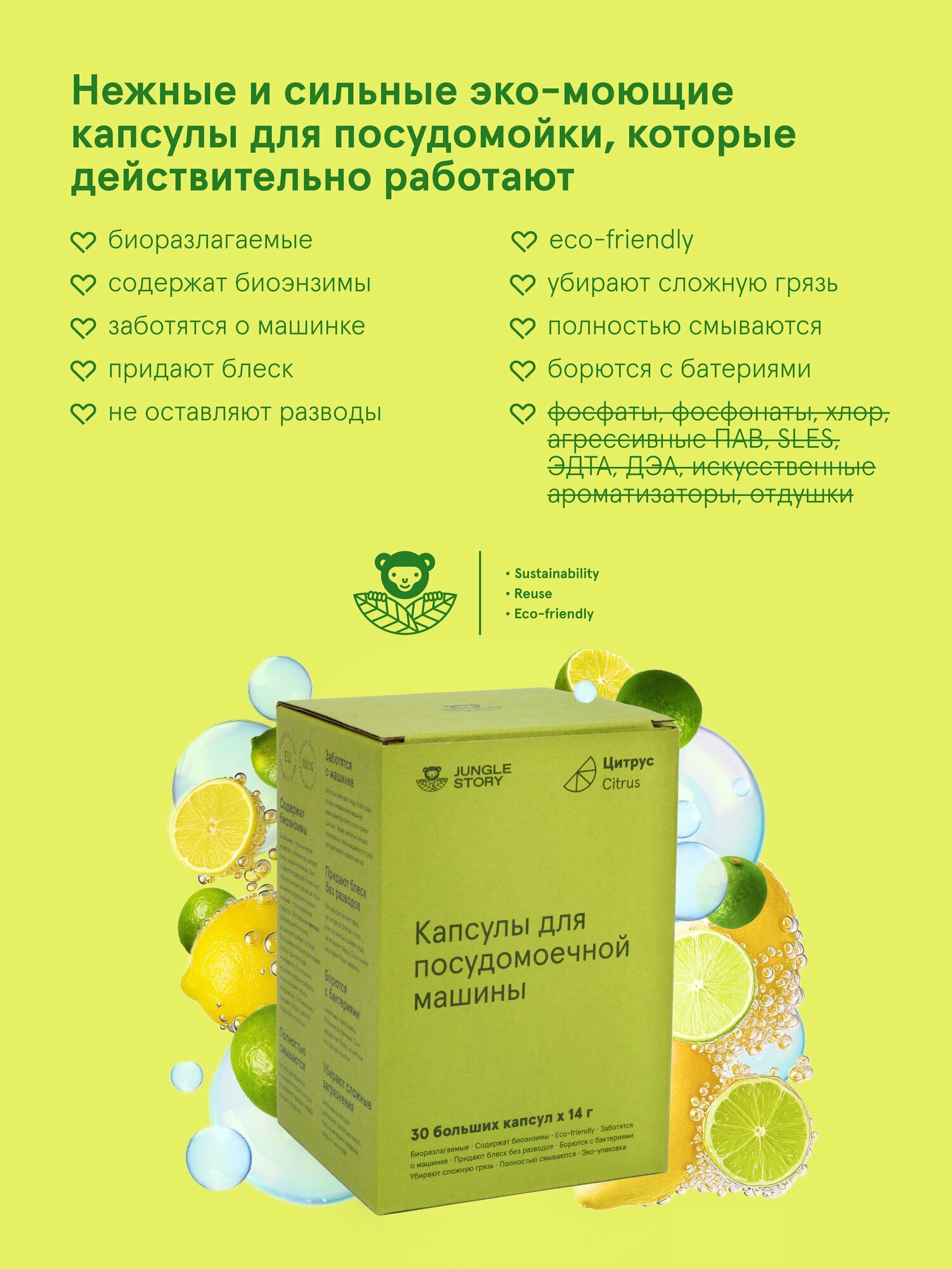 Капсулы для посудомойки Jungle Story Citrus, биоразлагаемые, 30 штук интересное: