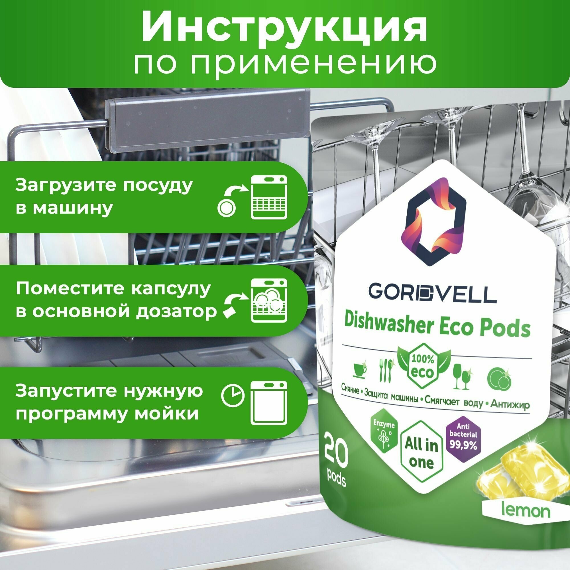 Капсулы для посудомоечных машин Gordvell Eco All in One Lemon 20 шт, экологичное средство для мытья посуды в ПММ интересное: