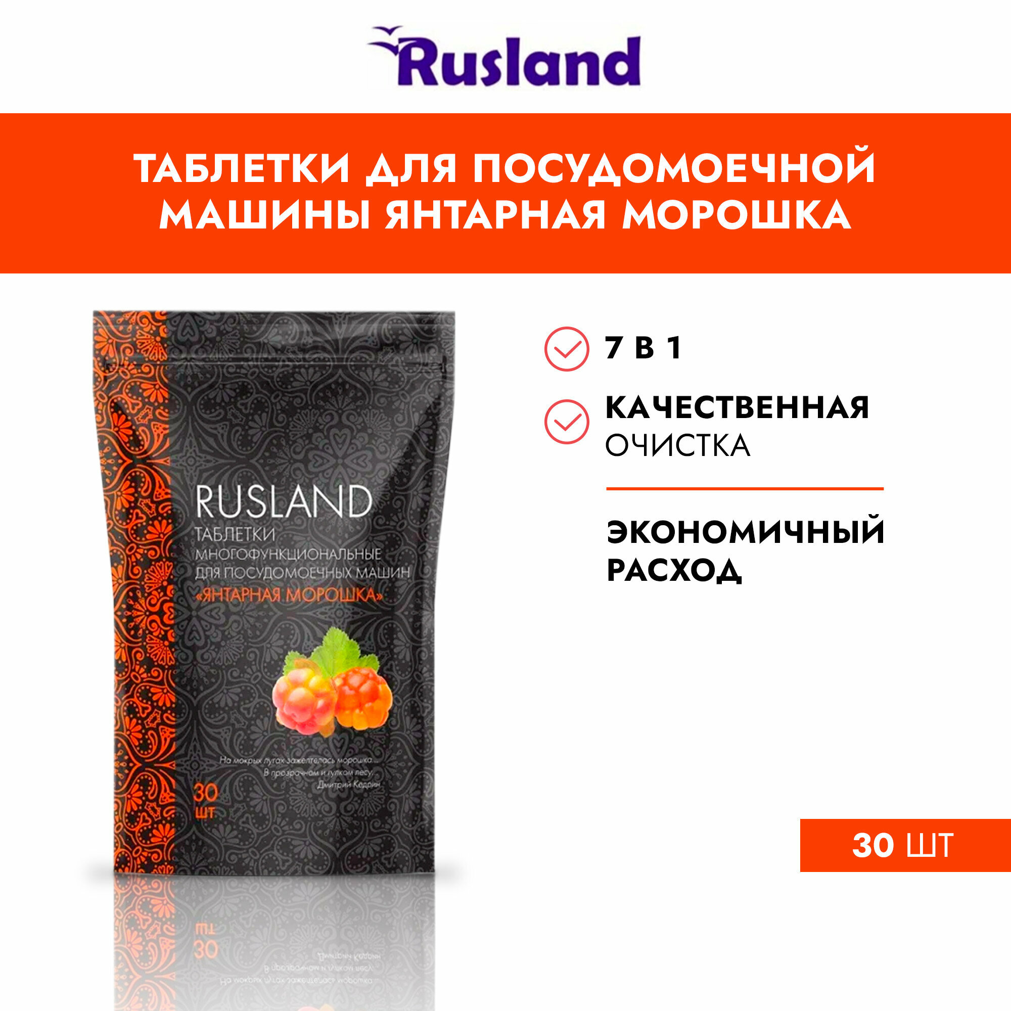 Купить Rusland Таблетки многофункциональные для посудомоечных машин 7 в 1 "Янтарная морошка" 30 шт.