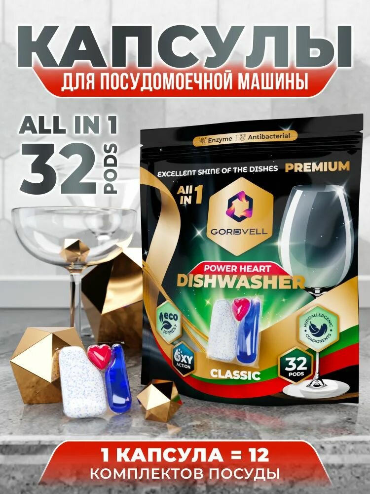 Капсулы таблетки для посудомоечной машины Gordvell Eco All in One Classic 32 шт, экологичное средство для мытья посуды в ПММ интересное: