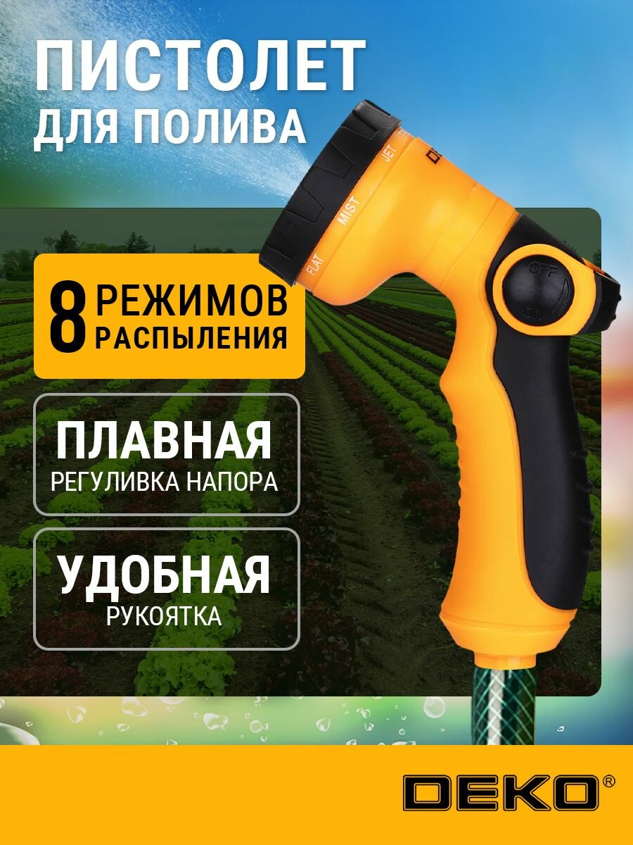 Пистолет для полива DEKO, DKI01, оранжевый, 16мм, 8 режимов, блистер интересное: