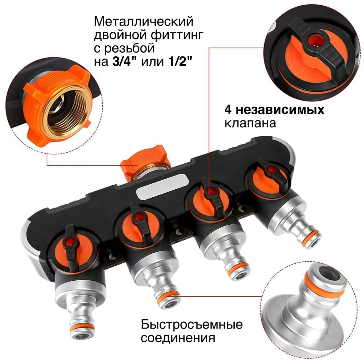 Распределитель садовый для полива, четырехканальный, на 4 выхода, механическое управление, 1шт