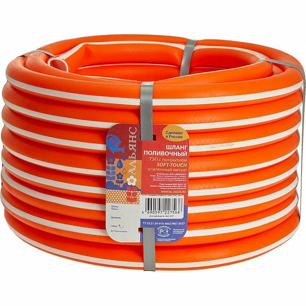 Купить Шланг поливочный 20 мм, 20 м, ТЭП с покрытием Soft-touch усиленный нитью альянс оранжевый