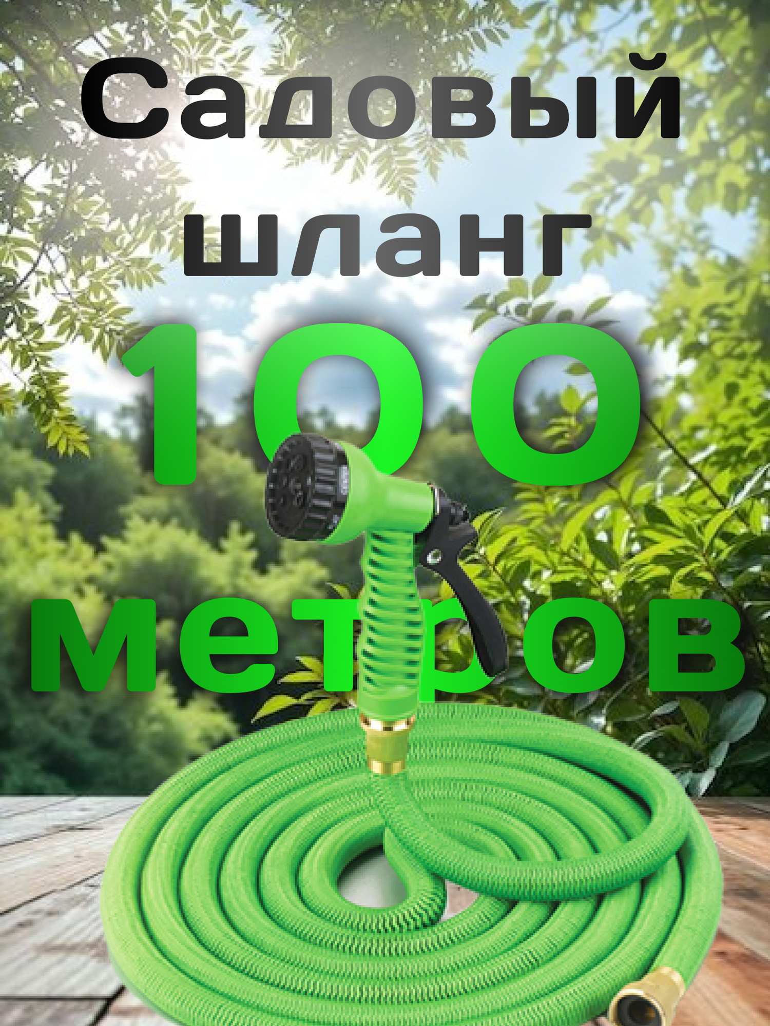 Купить Шланг садовый растягивающийся 100 метров для полива с распылителем/ 100 метров зеленый с металлическим соединением