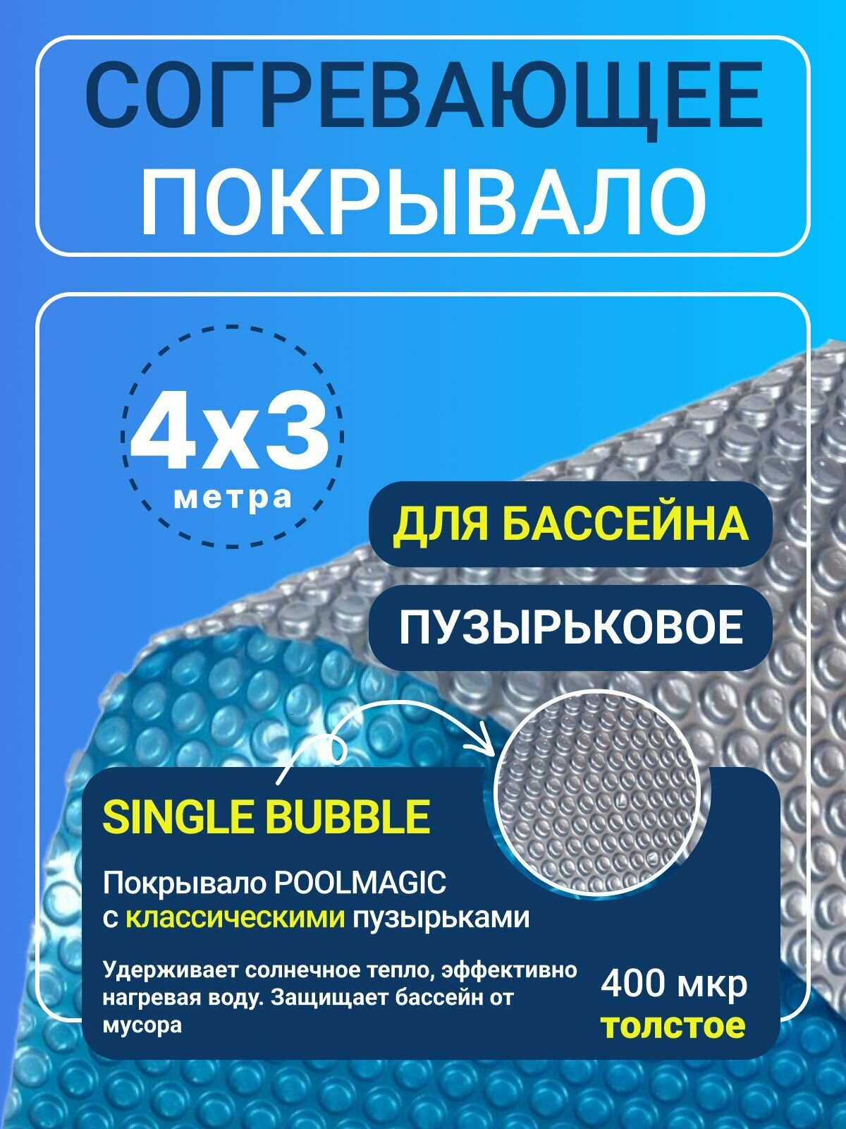 Согревающее покрывало 9.5х4 м Poolmagic SINGLE BUBBLE пузырьковое плавающее, синее/серебристое, 400 мкм, тент для бассейна / Аксессуары для бассейна