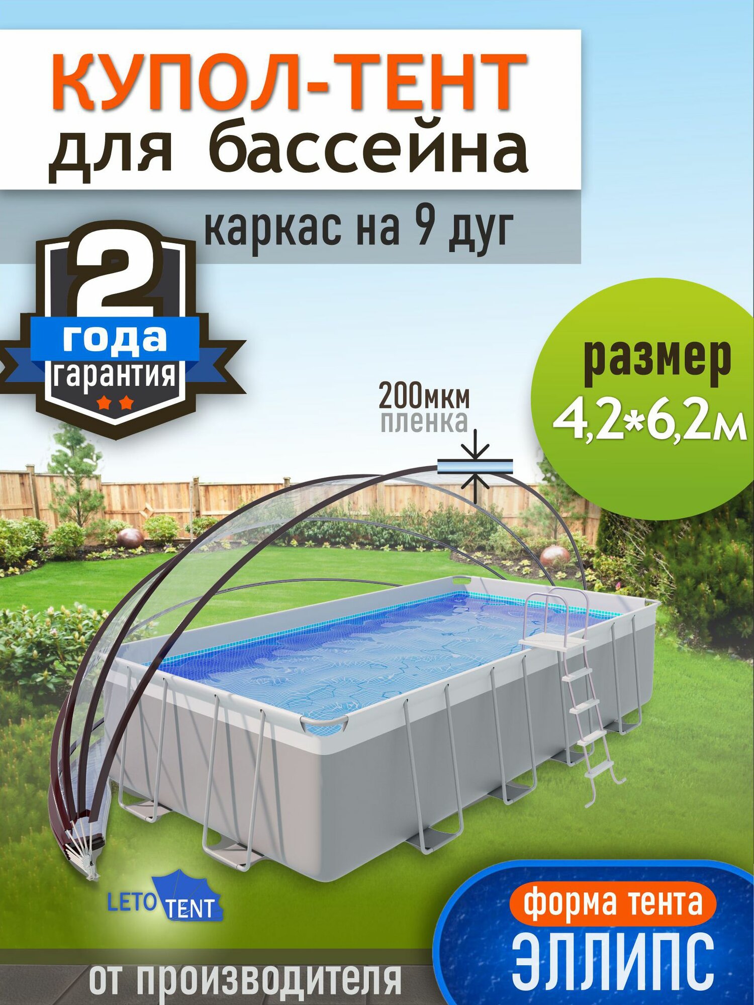 Купить Купол Тент для бассейна Летотент эллипс 4,2м*6,2м 200 микрон 9 дуг