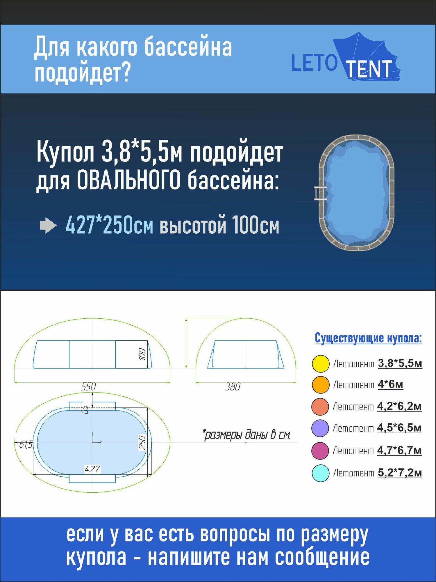 Купол-Тент для бассейна Летотент эллипс 3,8*5,5м 300 микрон 7 дуг