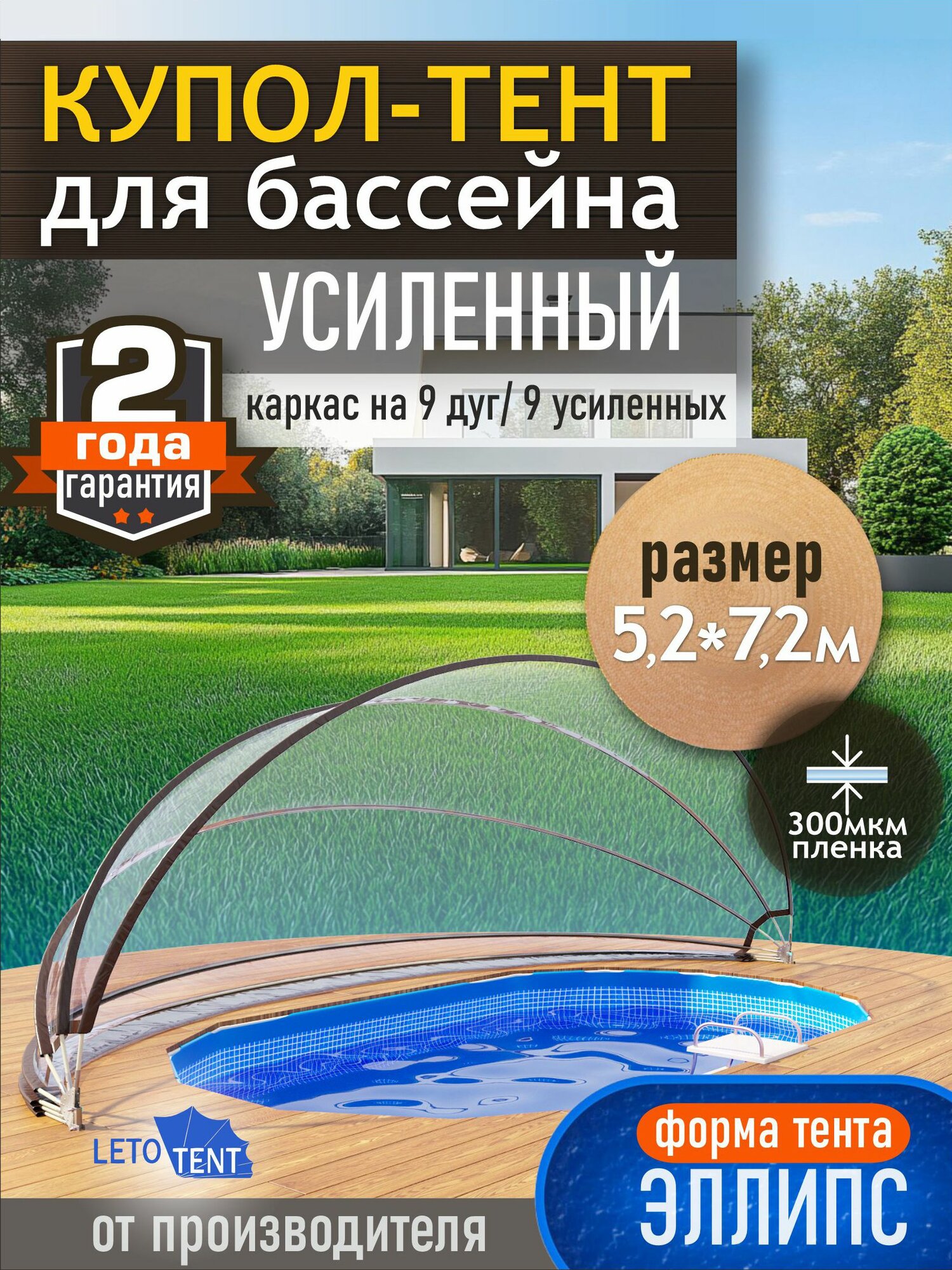 Купол Тент для бассейна Летотент эллипс 5,2м*7,2м 200 микрон 9 дуг/9ус