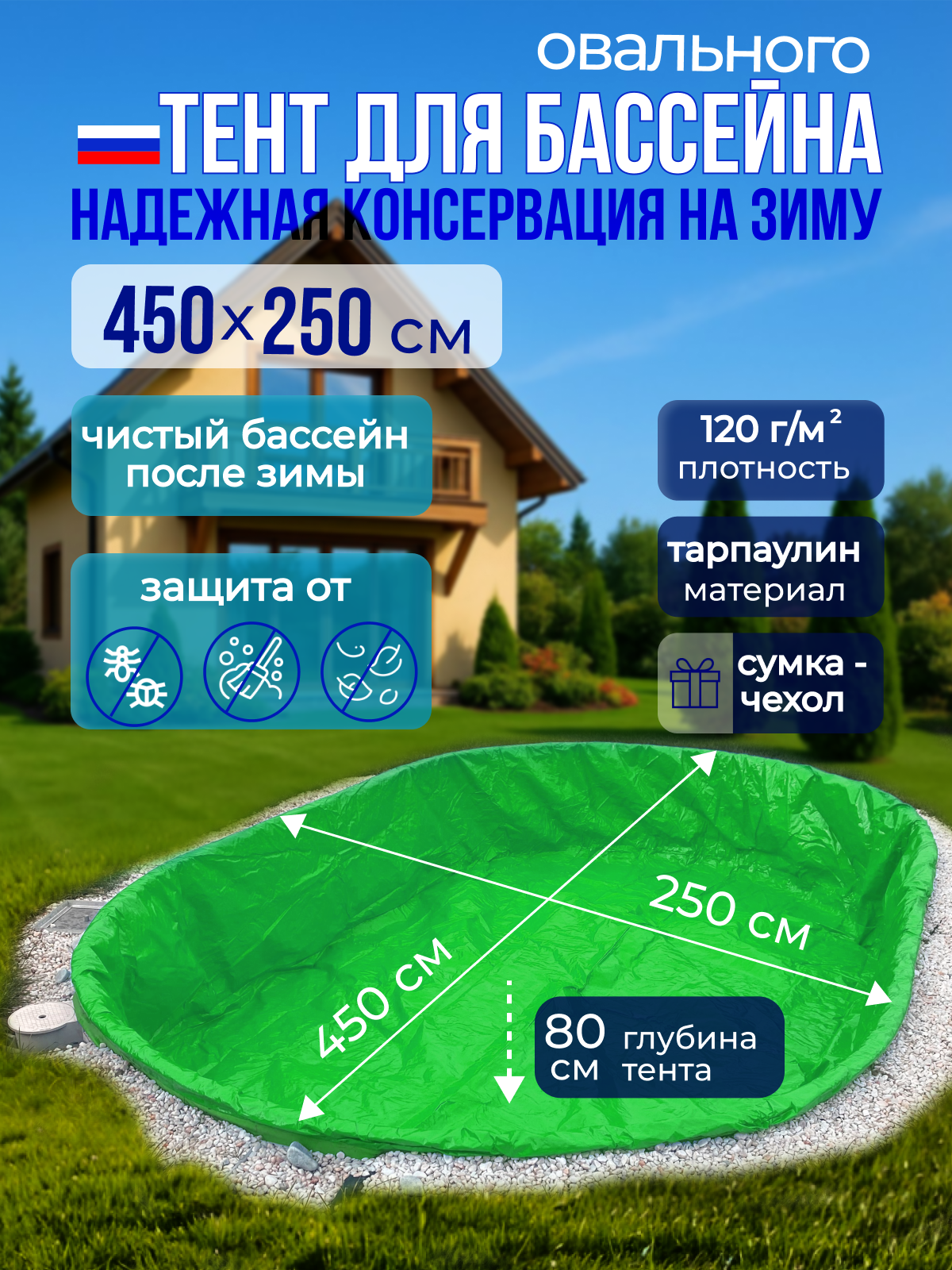 Тент Лагуна, для зимней консервации, овальный, зеленый, для каркасного бассейна, 3,5x2,5 м
