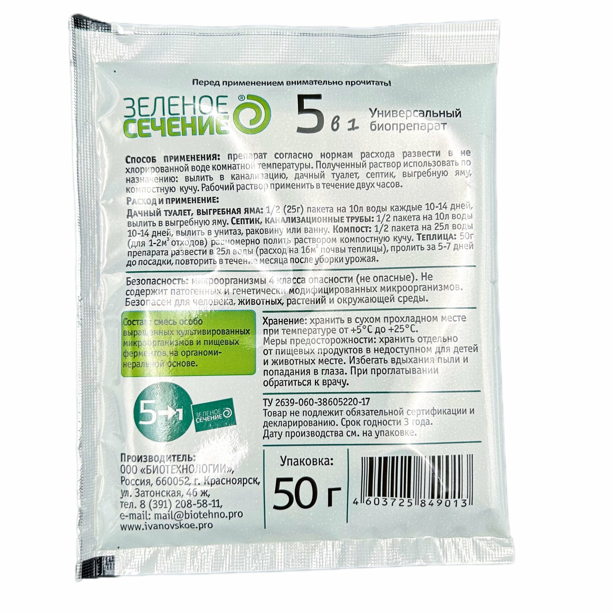 Универсальное средство для туалета, септика, труб Зеленое Сечение Универсальный биопрепарат 5в1 50гр / 8шт интересное: