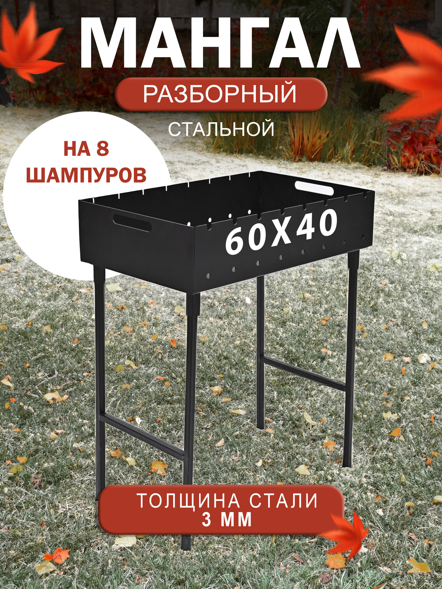 Мангал, Кованые Изделия, разборный, сборный, стальной, переносной, на ножках, на 8 шампуров 60х40х13 мм толщ. стенки 2мм