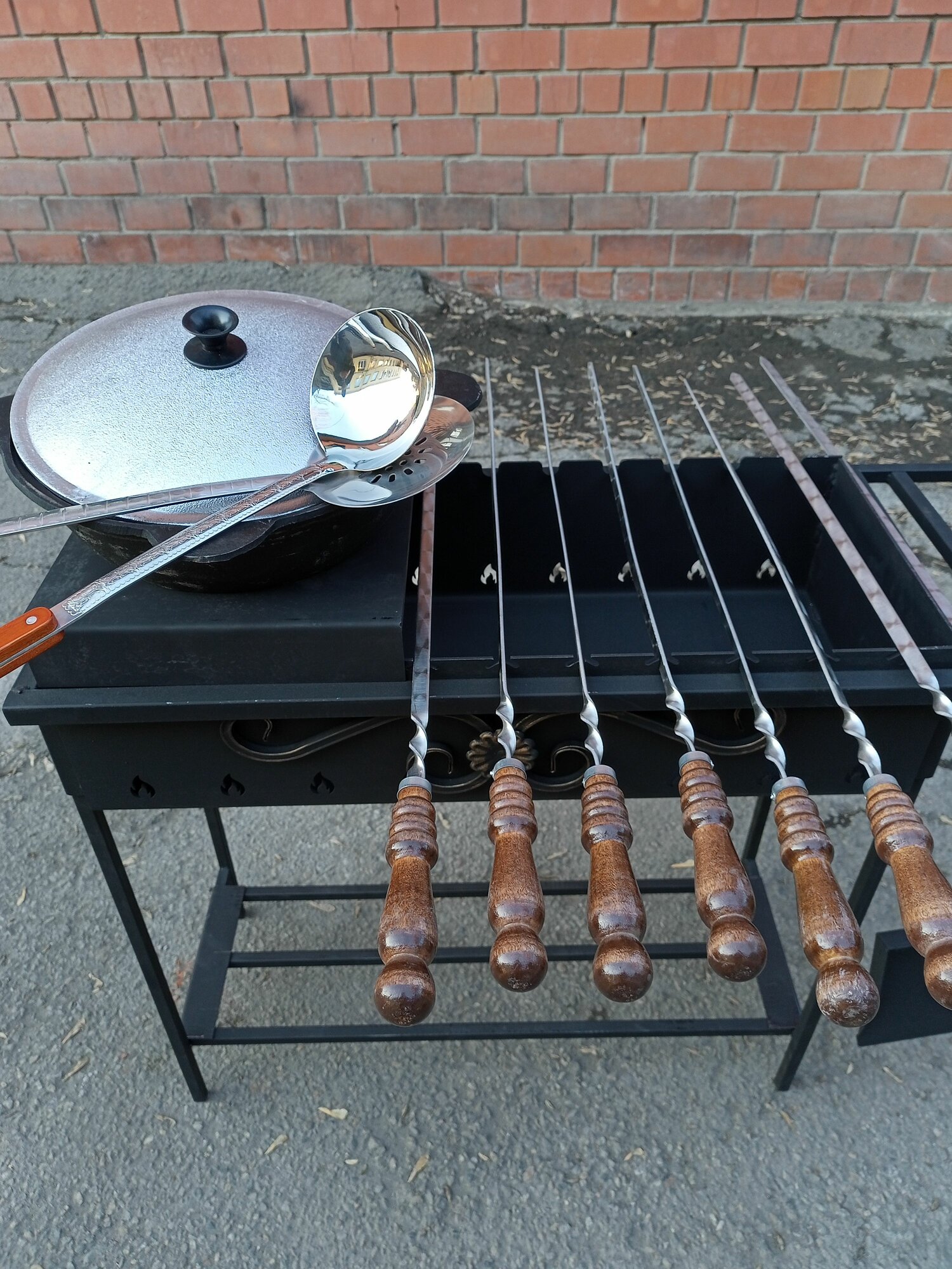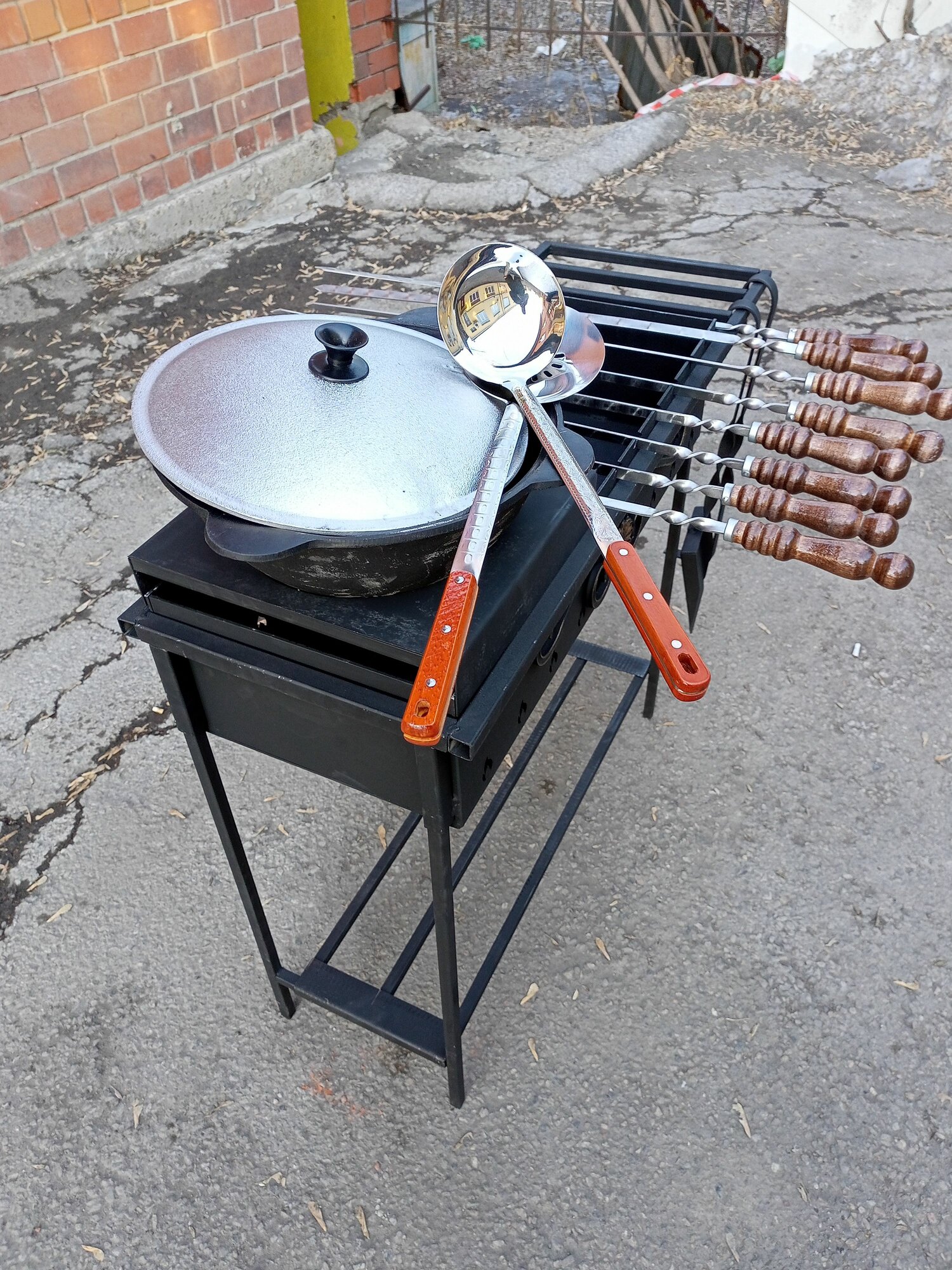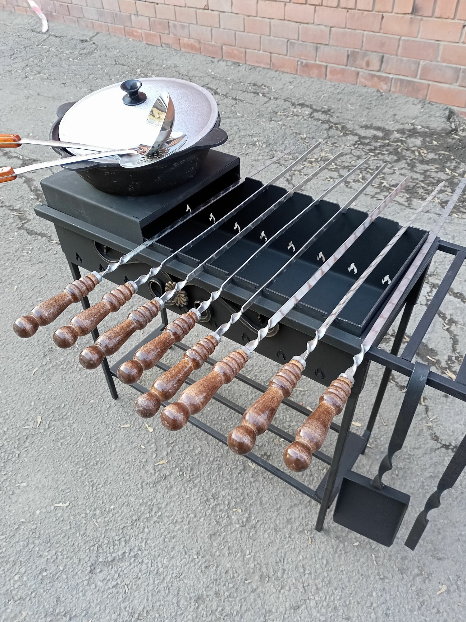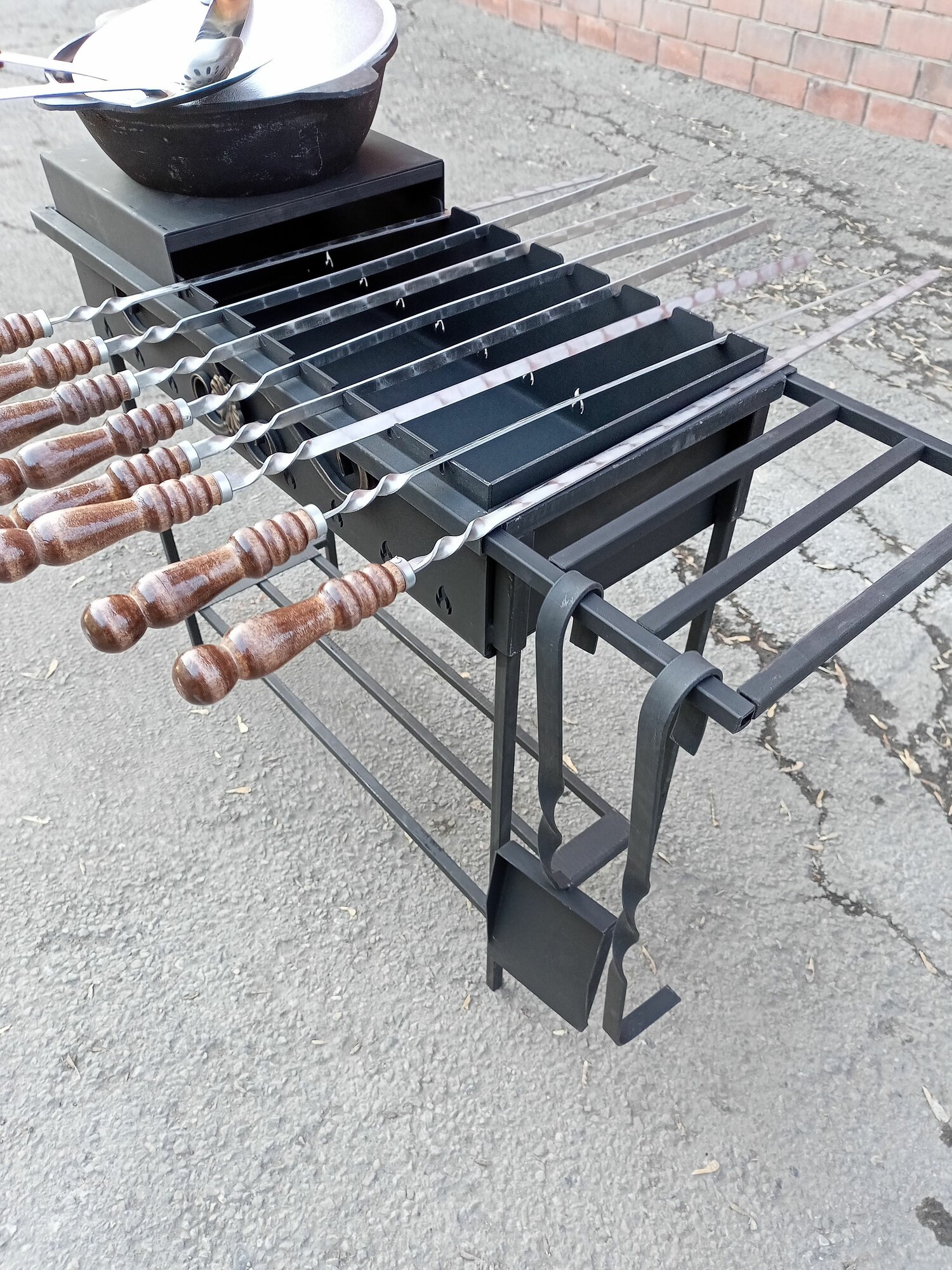 Гриль мангал усиленный 3мм с подказанником и 4л казаном чугунным. Полный комплект барбекю с шампурами интересное: