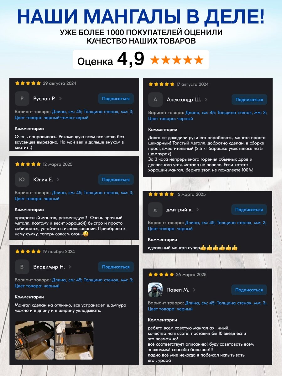 Ниже Вы можете прочитать отзывы на Мангал сборный складной сталь 3 мм, ознакомится с подробными характеристиками, посмотреть интересные обзоры и фотографии на Мангал сборный складной сталь 3 мм.