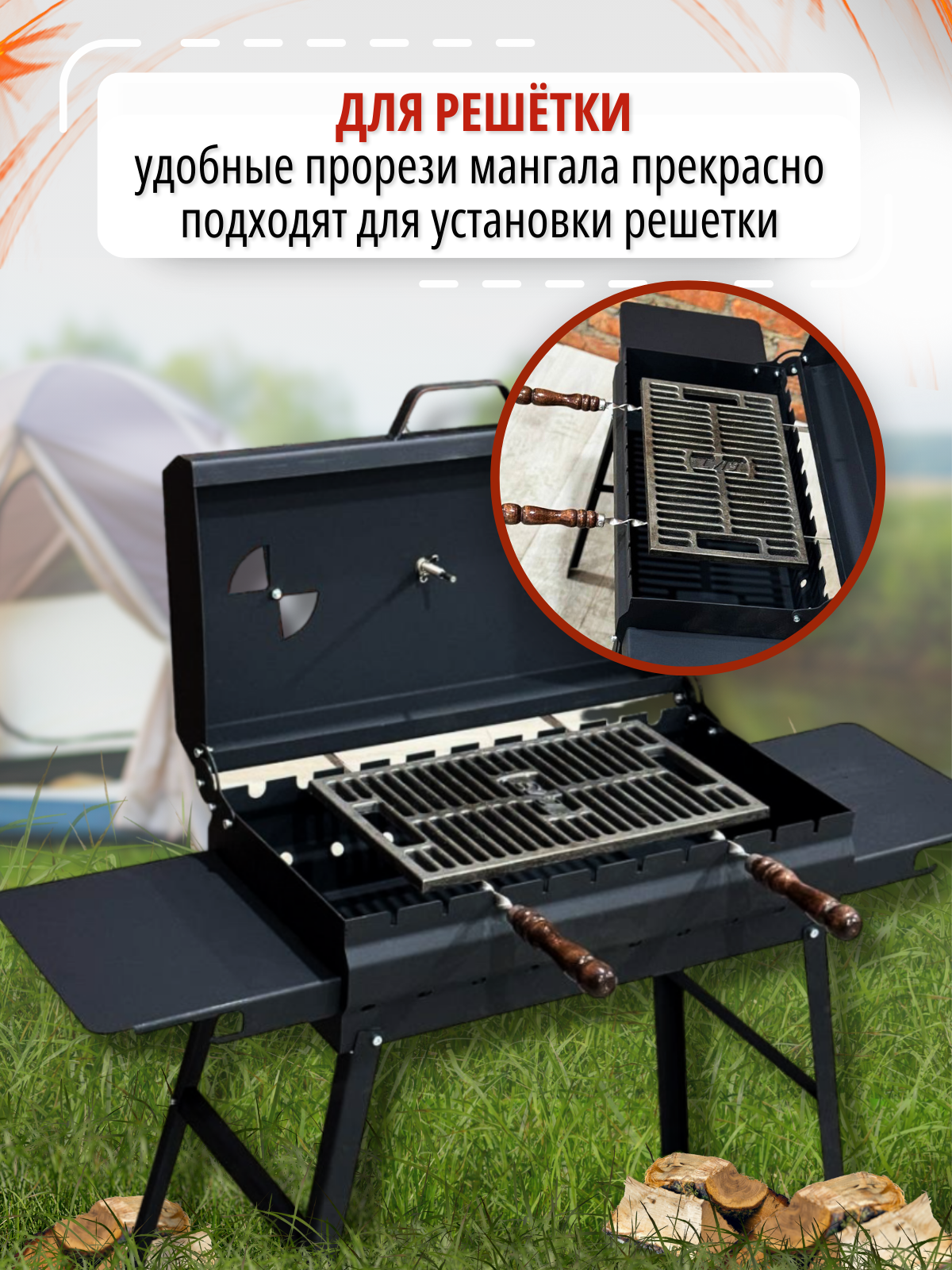 Мангал гриль KazanTop с крышкой для дачи шашлыка с подказанником, решеткой для мангала, совком и кочергой, 2 мм
