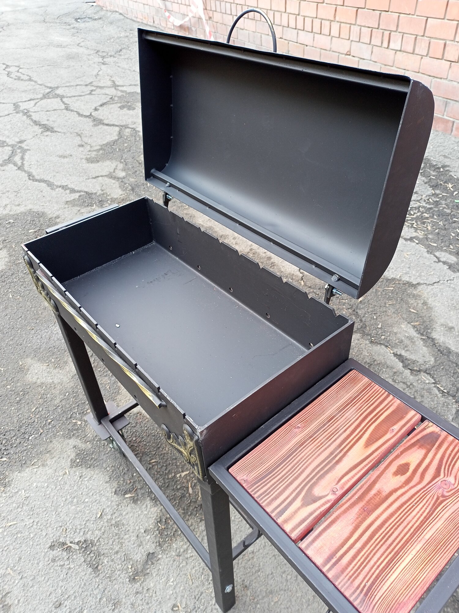 Усиленный мангал 5мм горячекатанная сталь. Барбекю с крышкой. Жаровня с полочкой деревянной. Гриль лофт с дровницей интересное: