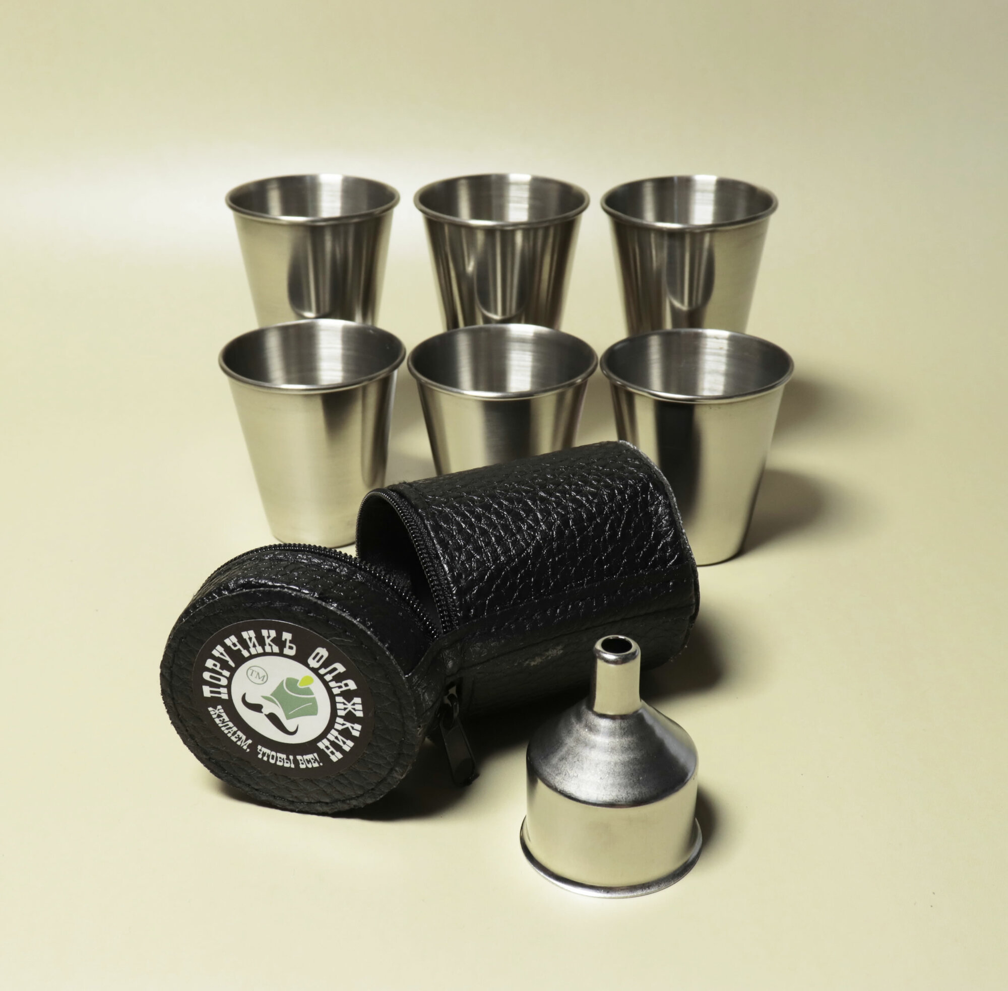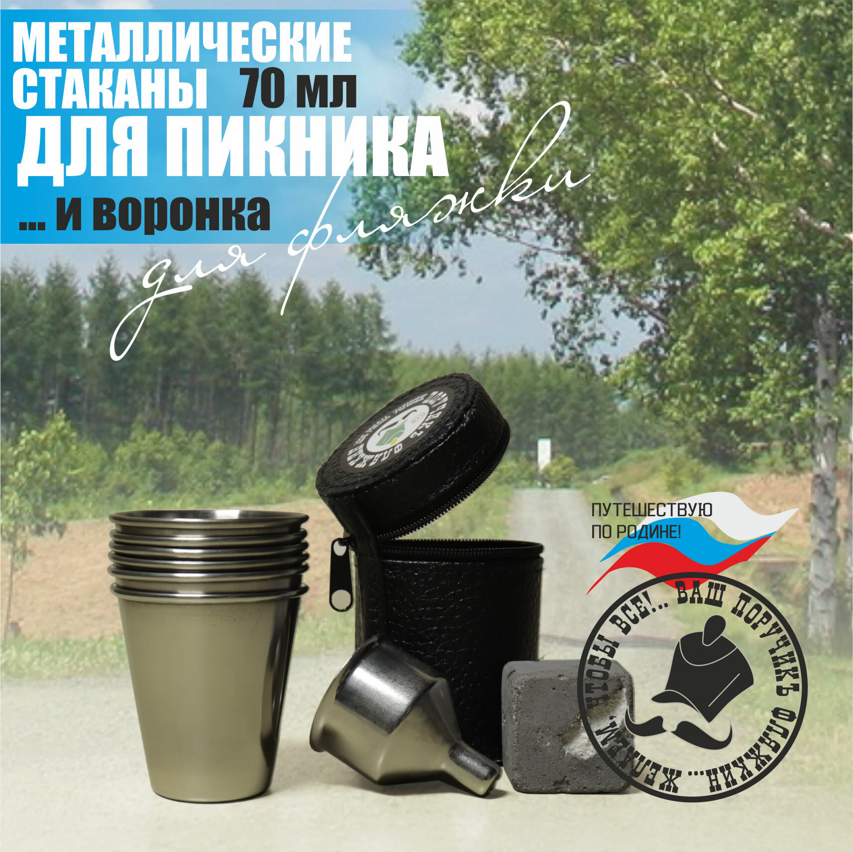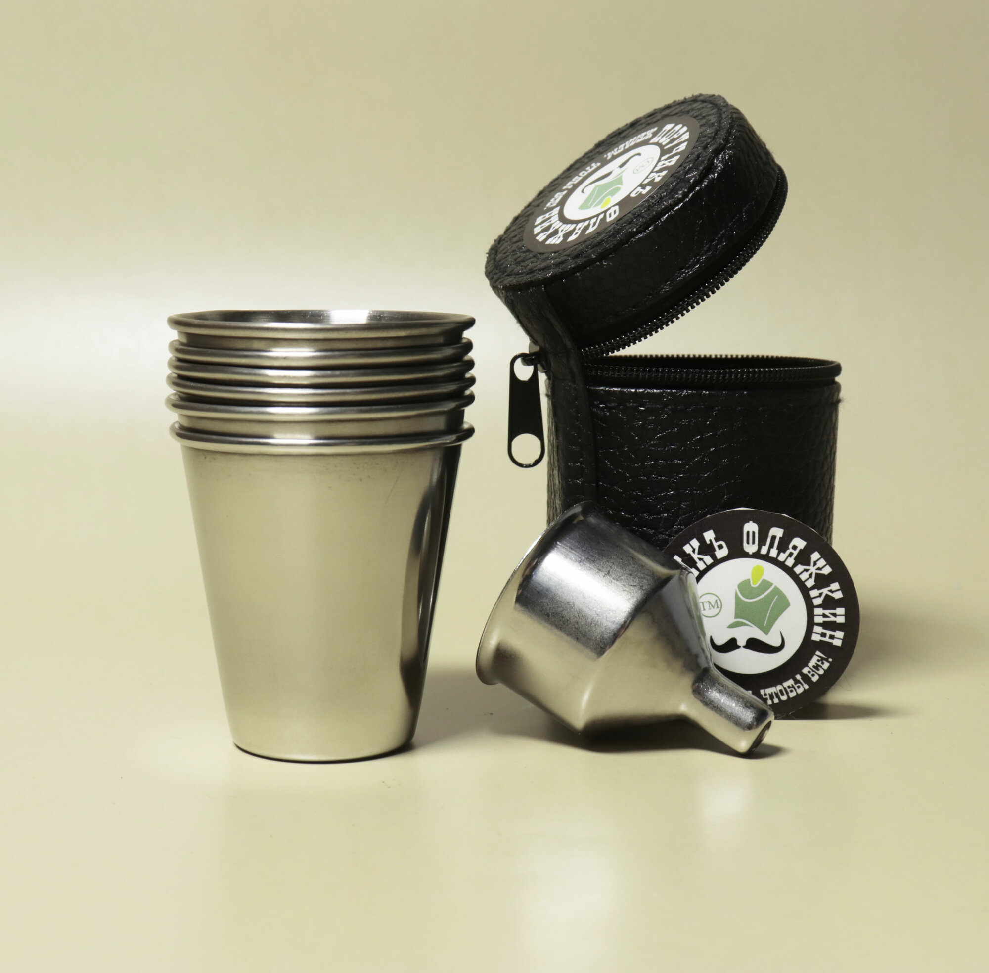Комплект в чехле: шесть металлических стаканов (70мл) для пикника + воронка для фляжки интересное:
