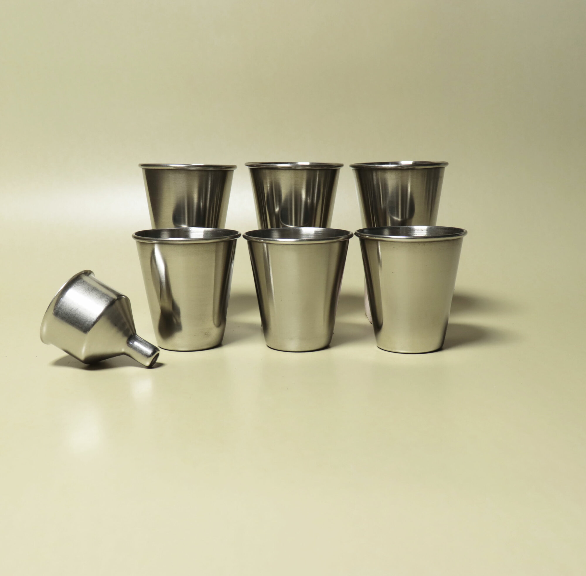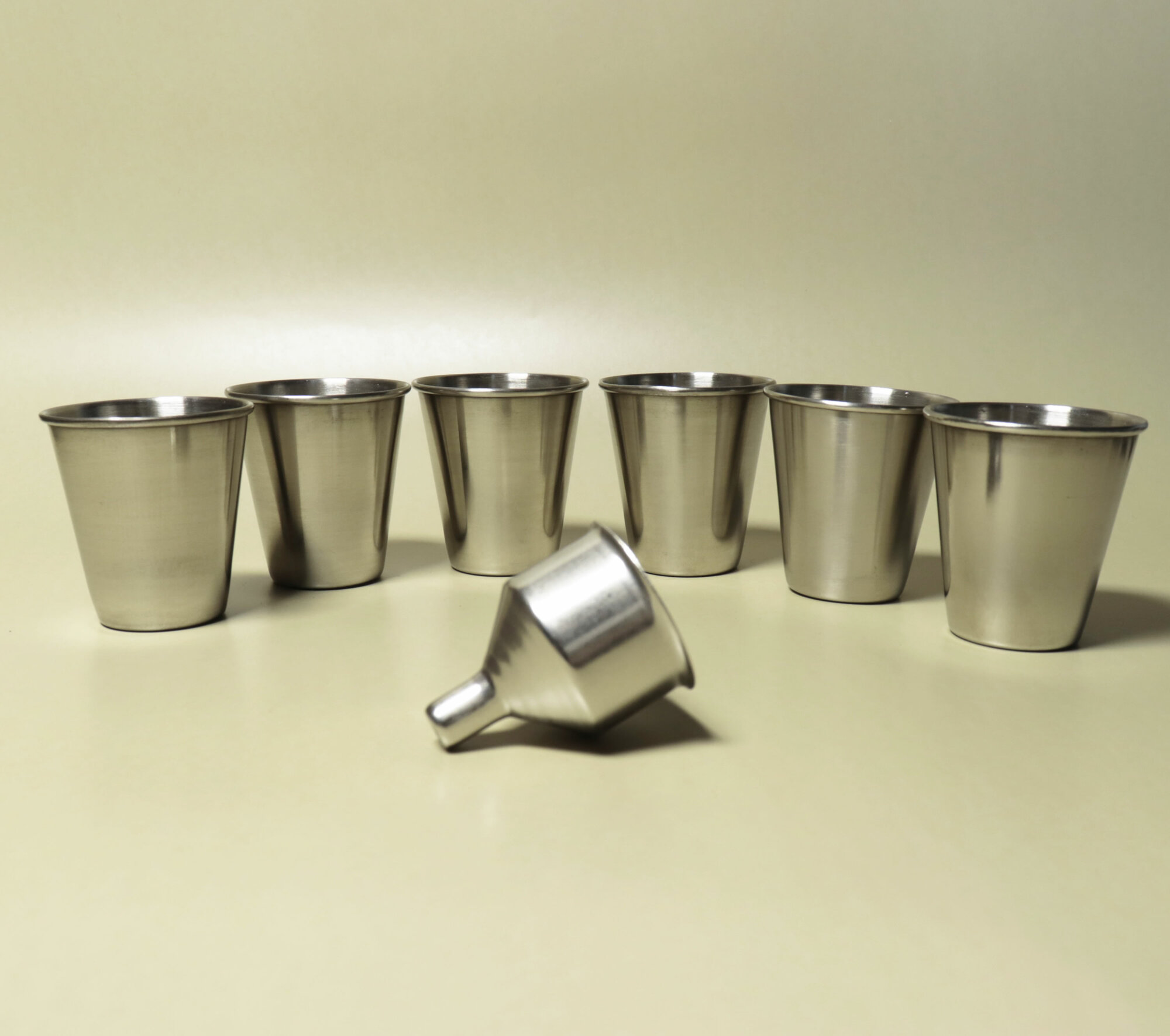 Купить Комплект в чехле: шесть металлических стаканов (70мл) для пикника + воронка для фляжки