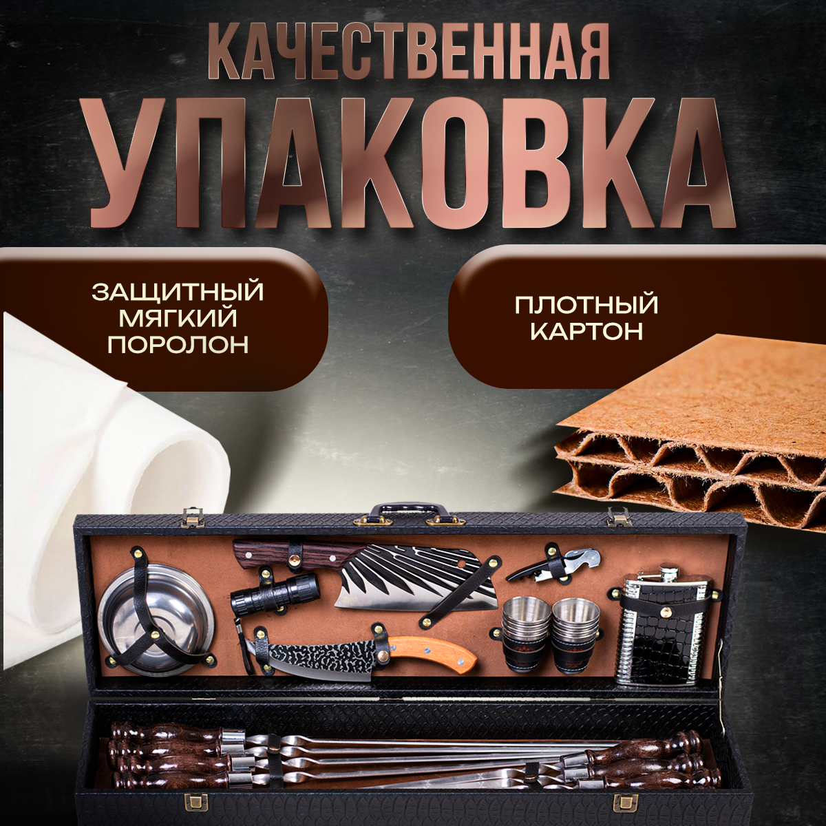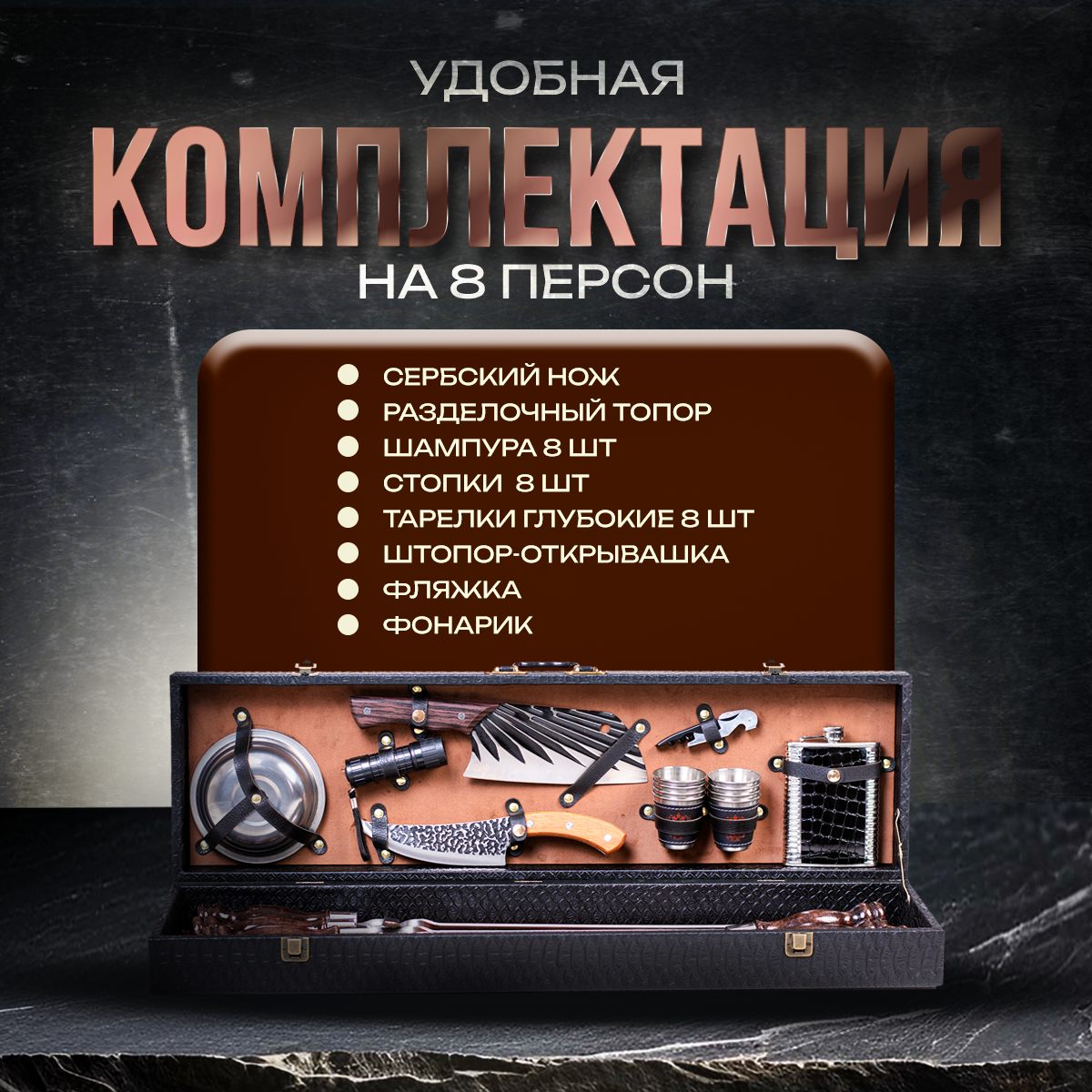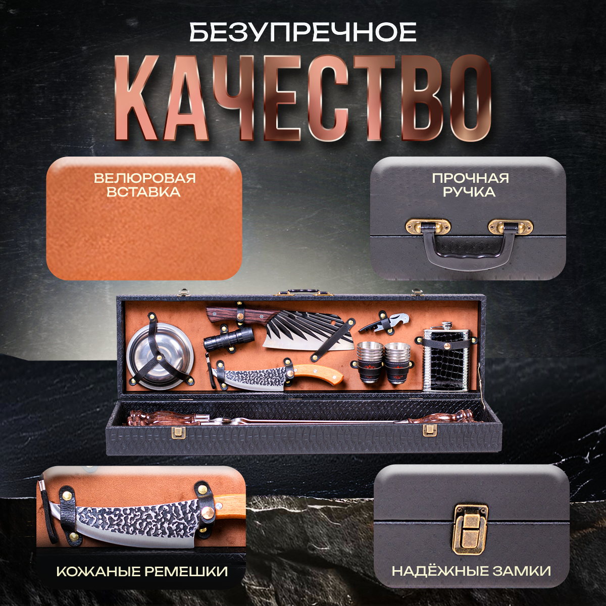 Набор для пикника подарочный в кейсе № 22 от GRILLS FACTORY. На 8 персон, с коричневым велюром внутри интересное:
