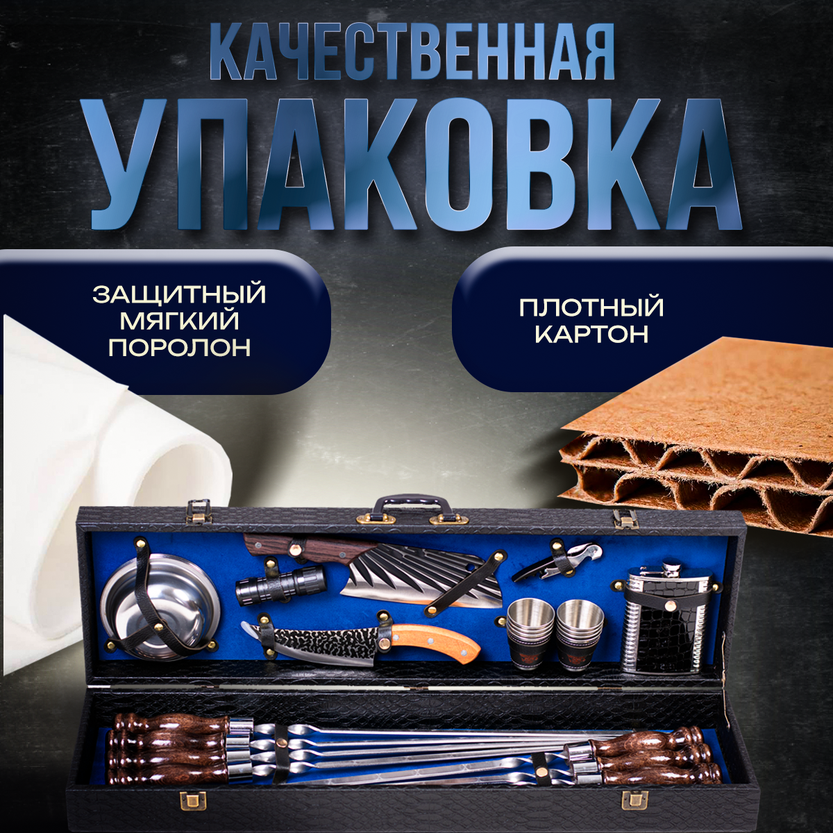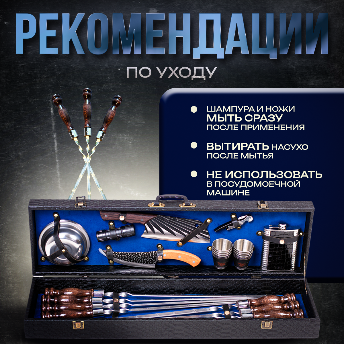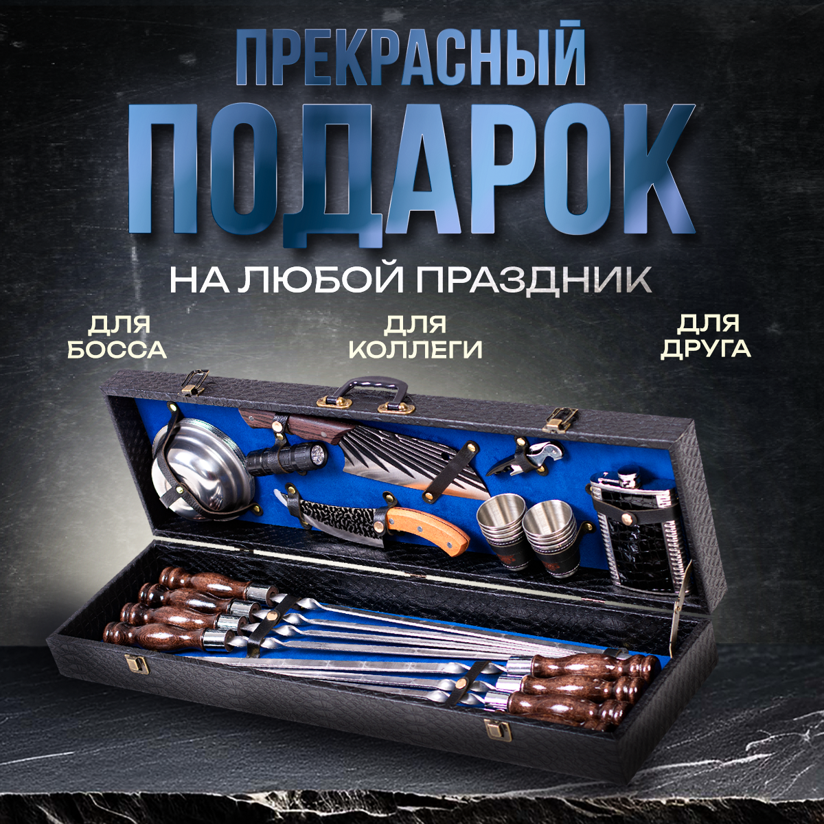 Шашлычный набор подарочный в кейсе № 22 от GRILLS FACTORY. На 8 персон, с синим велюром внутри интересное: