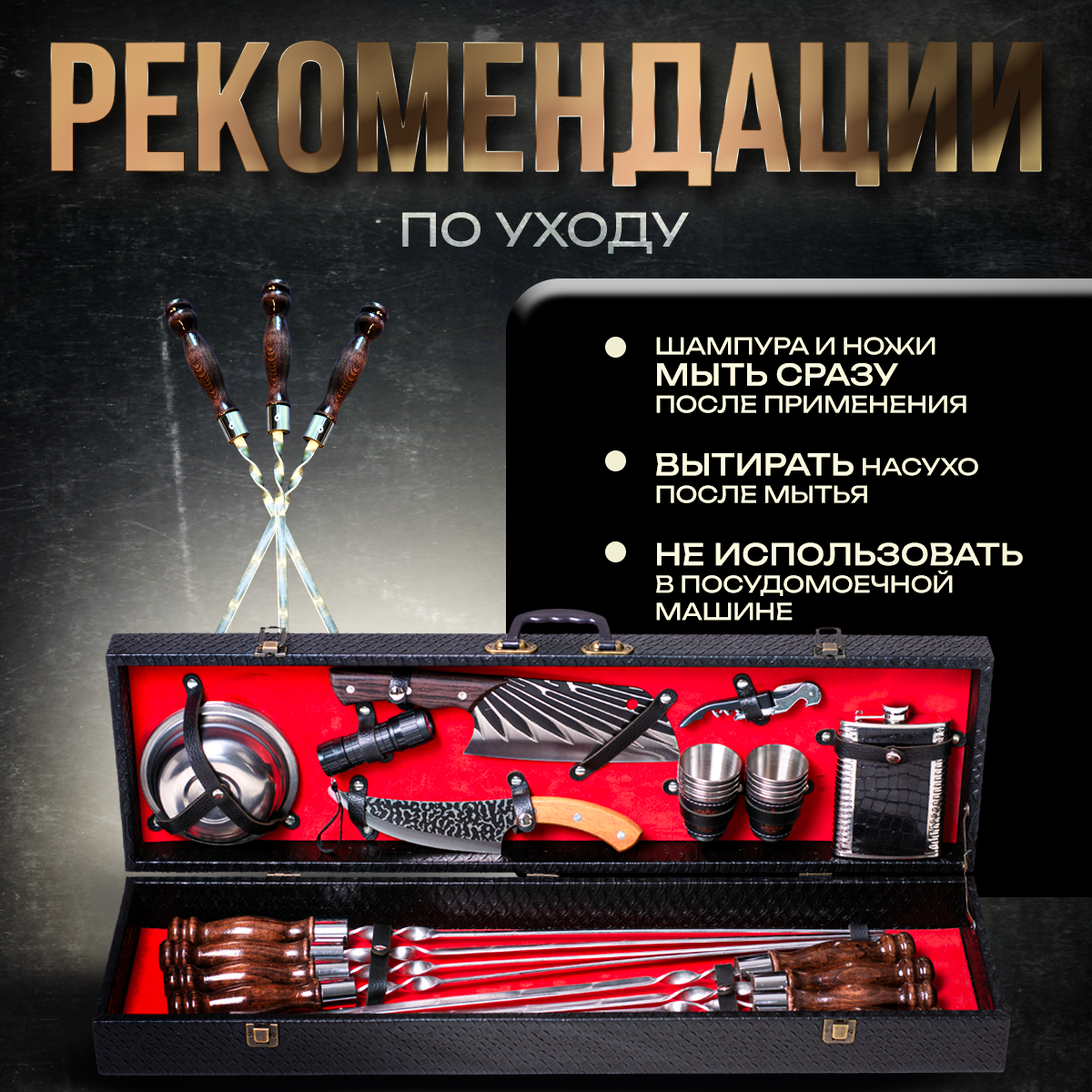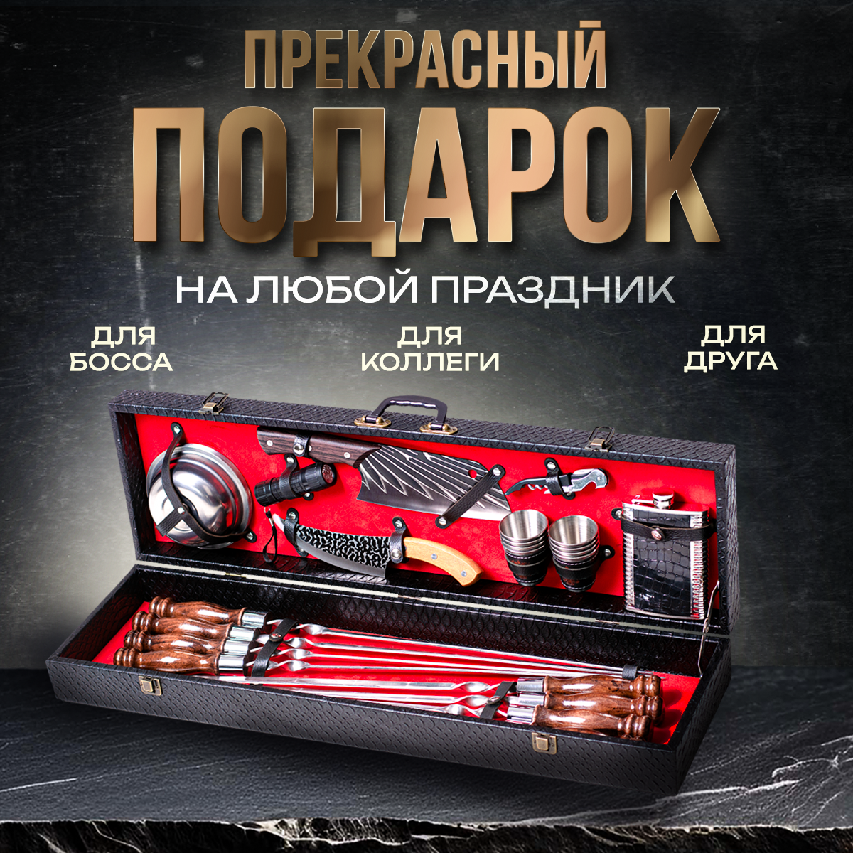 Набор для шашлыка подарочный в кейсе № 22 от GRILLS FACTORY. На 8 персон, с красным велюром внутри интересное: