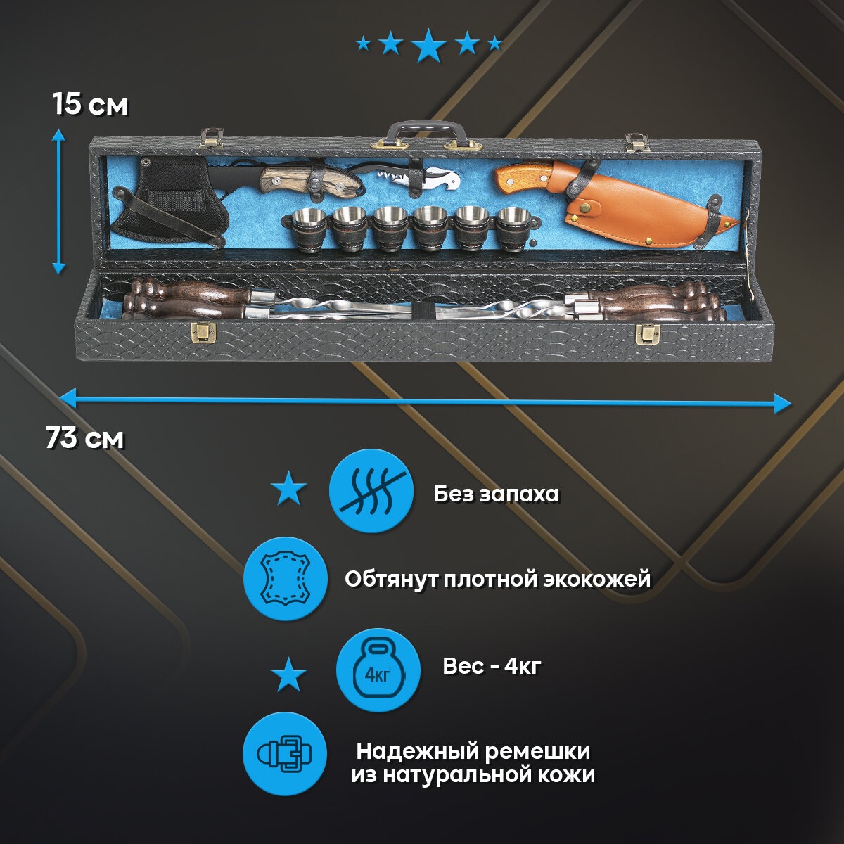 Набор для шашлыка подарочный в кейсе № 29 от GRILLS FACTORY. На 6 персон, с синим велюром внутри интересное: