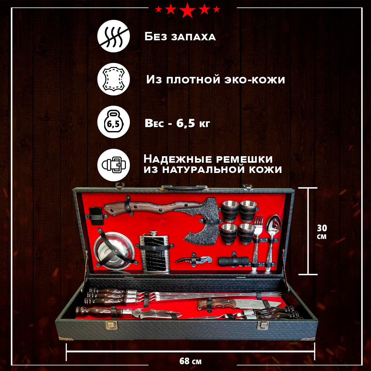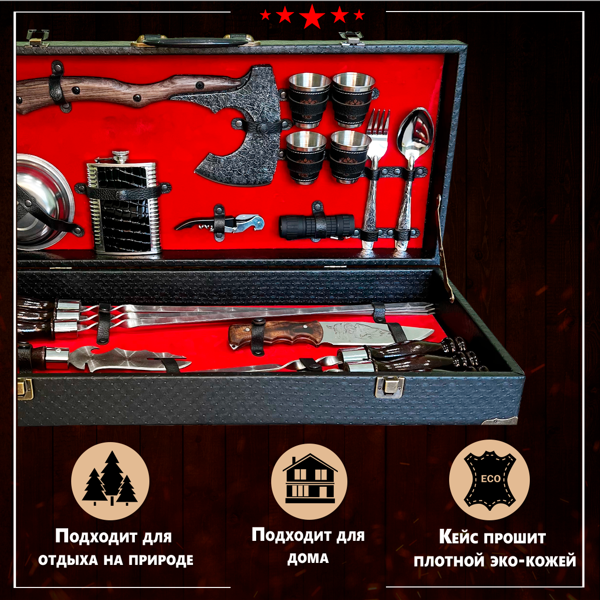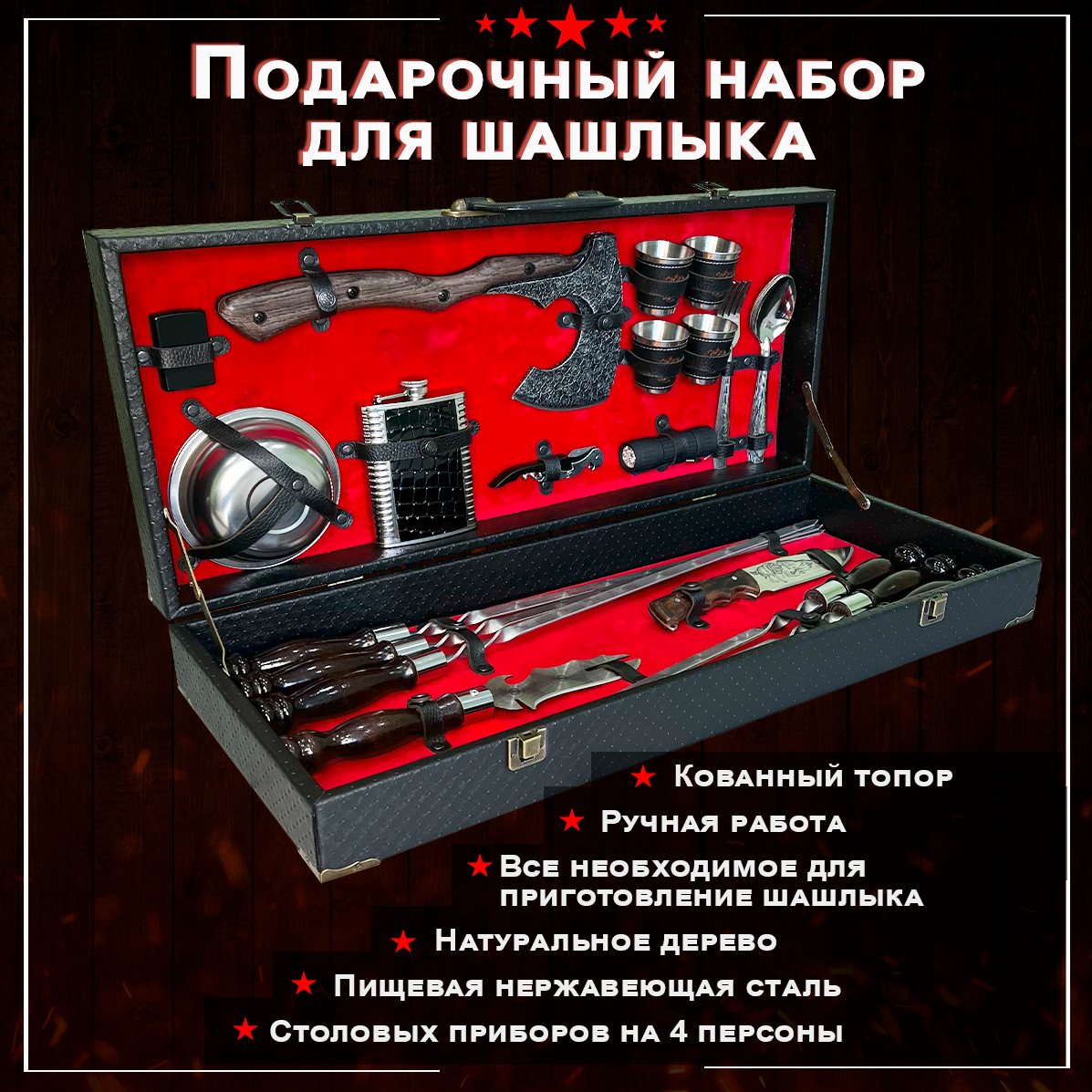 Шашлычный набор подарочный в кейсе № 24 от GRILLS FACTORY. На 4 персоны, с красным велюром внутри интересное: