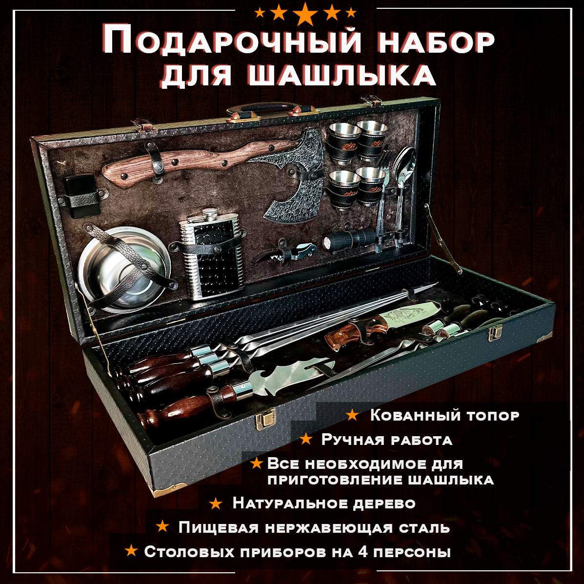 Шашлычный набор подарочный в кейсе № 24 от GRILLS FACTORY. На 4 персоны, с красным велюром внутри